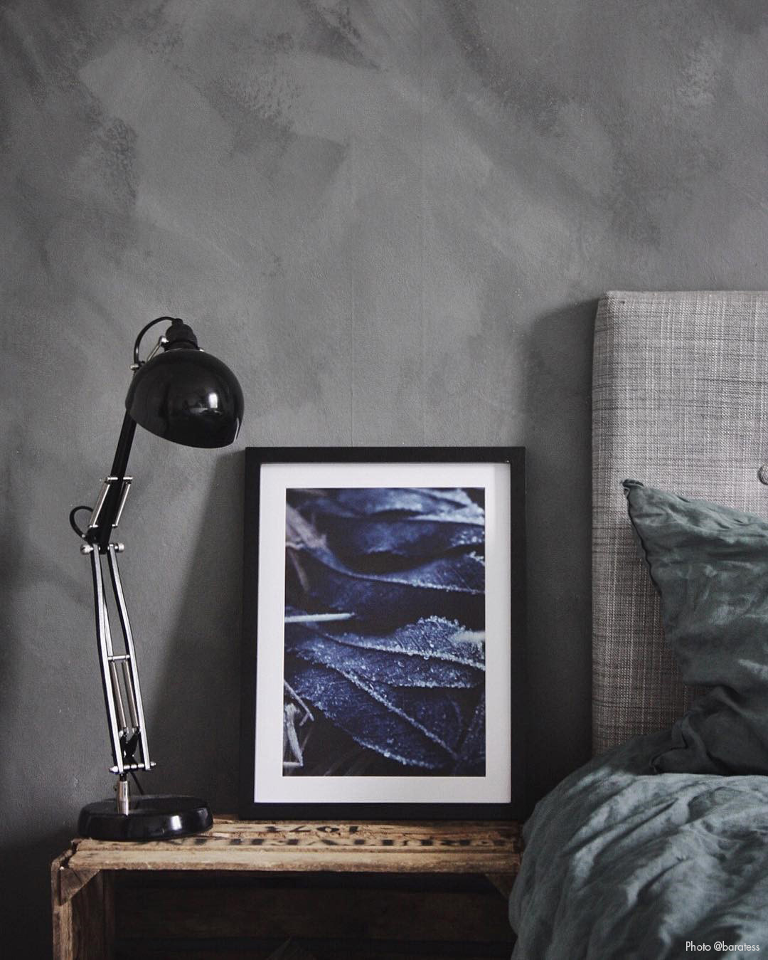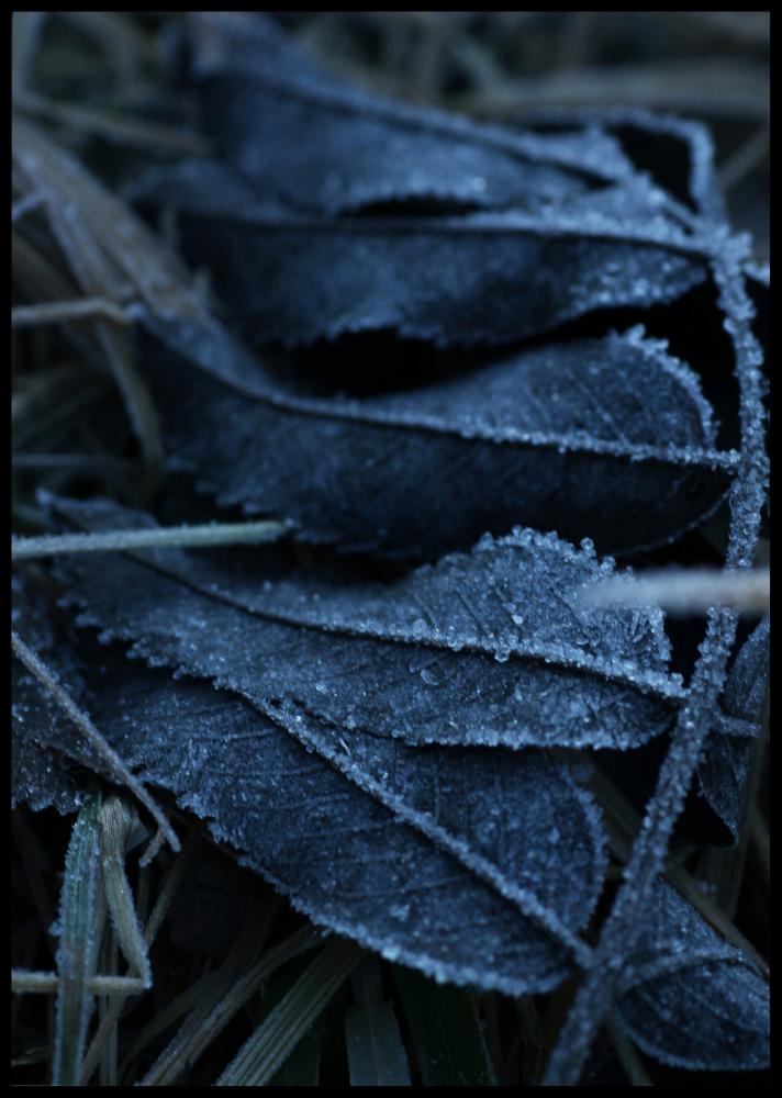 Dypt og mørkt fotografi med et frossent nærbilde av et rogneblad, produsert i samarbeid med fotografen Ragnhild Furulund. Den lave dybdeskarpheten på bildet gjør at man bare forestiller seg hele bladet og det danner et kaldt, blåsvart mønster. Plakaten ser bra ut i en mørk treramme eller en enkel, svart eller hvit treramme, og passer inn i rom som trenger litt mystikk. Motivet passer sammen med andre bilder som har et mørkt inntrykk og framheves best på en lys bakgrunn.