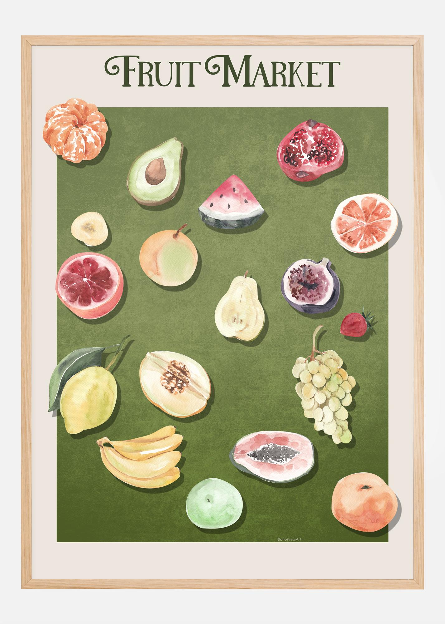Denne fargerike plakaten fanger essensen av et livlig fruktmarked og er et fantastisk tillegg til vår kolleksjon av interiørkunst. Trykket er en fryd for øyet med en rekke saftige frukter presentert mot en rik grønn bakgrunn, som skaper en følelse av friskhet og overflod. Fra de solmodne sitrusfruktene til de tropiske trekkene av avokado og granateple, tilbyr dette verket en visuell fest som både inspirerer og beriker. Hver frukt er skildret med en detaljrikdom som fremhever deres unike teksturer og former, noe som gjør denne plakaten til et must for alle som setter pris på naturtro kunst.
