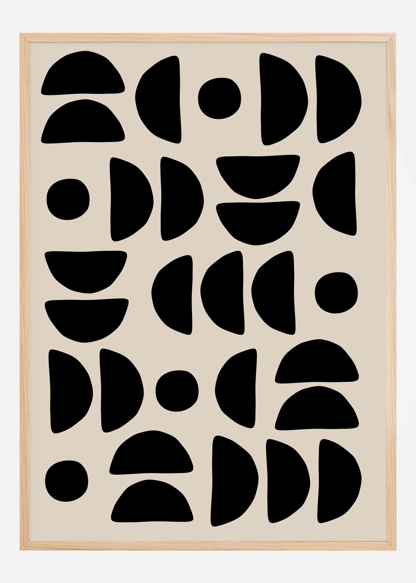 Denne kunstnerisk utformede plakaten utmerker seg med sitt dristige mønster av geometriske former i svart mot en beige bakgrunn. Den abstrakte designen er leken og rytmisk, noe som skaper en visuell spenning som er både moderne og tidløs. Dette verket kan oppfattes som en hyllest til både den organiske verden og de konstruerte elementene innen grafisk design, og passer perfekt for dem som verdsetter kunst med sterke, rene linjer og kraftfulle kontraster.