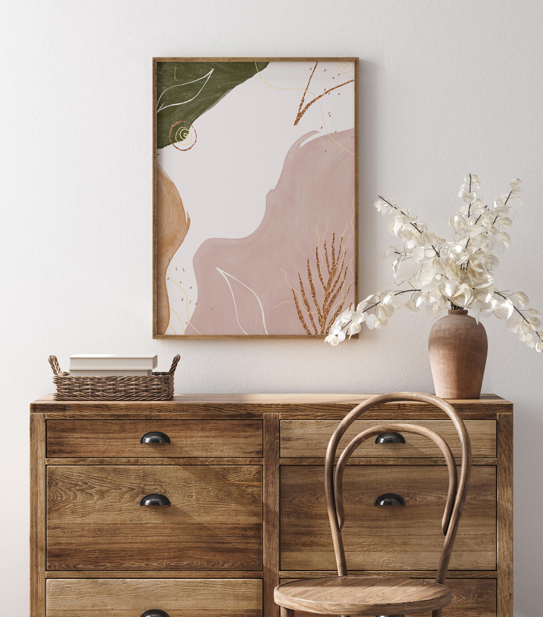 En fredelig abstrakt plakat med blader og en glitterdetalj. Store, bladformede fargeblokker fyller denne plakaten med små kvister laget av glitrende gull. Kombiner denne med en hvilken som helst pastellfarge for en pen ekstra detalj til veggen din.