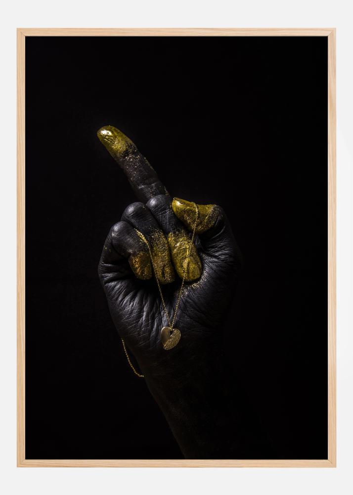 En dramatisk plakat med en svart hånd med gylne fingre som peker mot venstre. Den lukkede knyttneven bruker pekefingeren til å peke mot noe usynlig. Det henger et gyllent smykke rundt hånden, som faller elegant over de gylne fingrene. Kombiner dette med en hvit eller kremfarget vegg for et sterkt uttrykk.