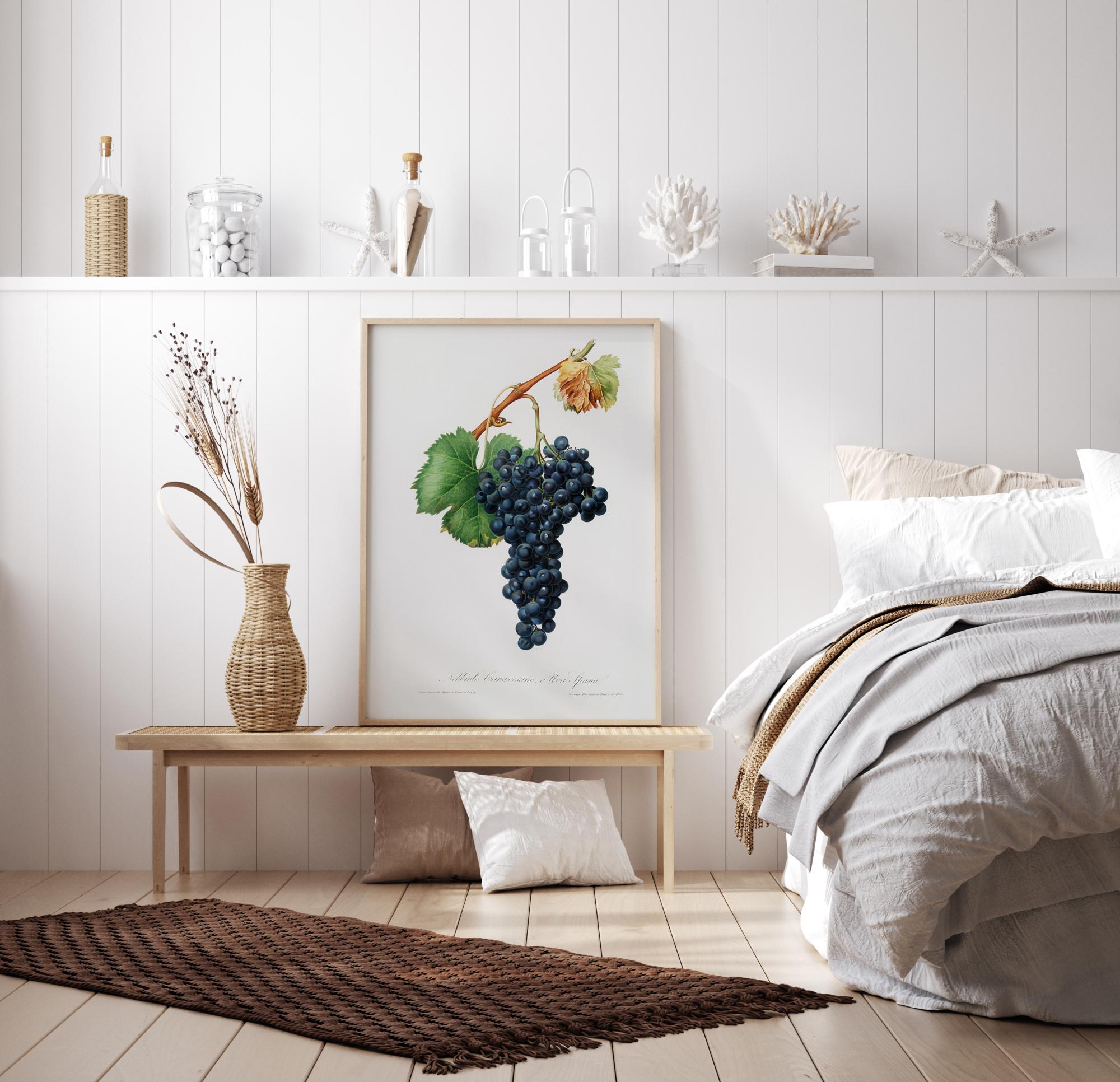 En detaljert botanisk plakat med en klase mørke, svarte druer på et vintre, som henger i midten av en hvit bakgrunn. De glatte svarte druene ser saftige ut, og dingler klare i midten av bildet. Heng dette på kjøkkenet ditt for litt matinspirasjon.