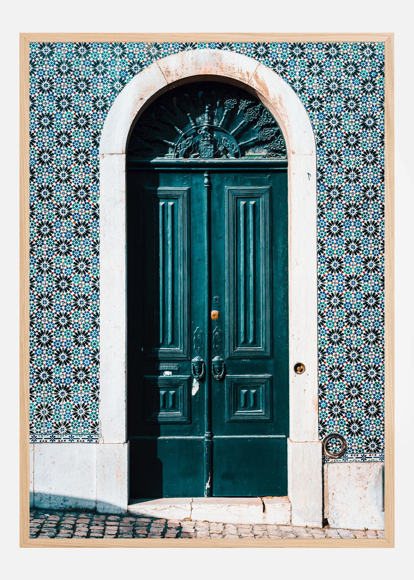 Denne stilige posteren viser en staselig grønn dør, som er vakkert innrammet av tradisjonelle, detaljrike fliser i blått og hvitt. Den klassiske designen og den dristige fargen på døren står i kontrast mot de intrikate mønstrene, noe som skaper en følelse av velkommenhet og kulturell rikdom. Bildet formidler følelsen av en innbydende entré til et hjem som er fylt av historie og karakter.