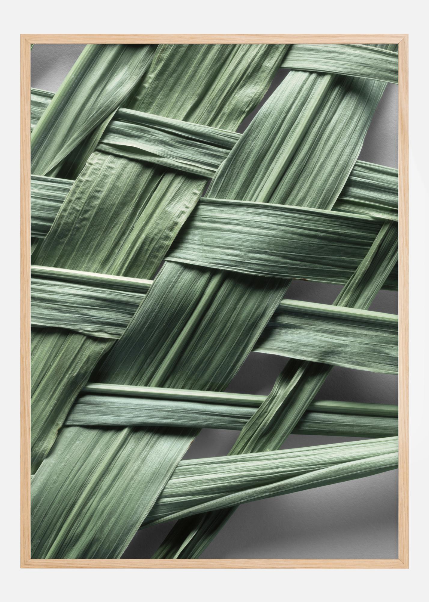 Denne stilrene og naturinspirerte posteren viser et detaljrikt vev av grønne blader, hvis linjer krysser hverandre i en organisert uorden. Den levende grønne fargen og de forskjellige teksturene som kommer frem i bladene skaper et beroligende og friskt inntrykk, noe som bidrar til en følelse av naturens nærvær innendørs.