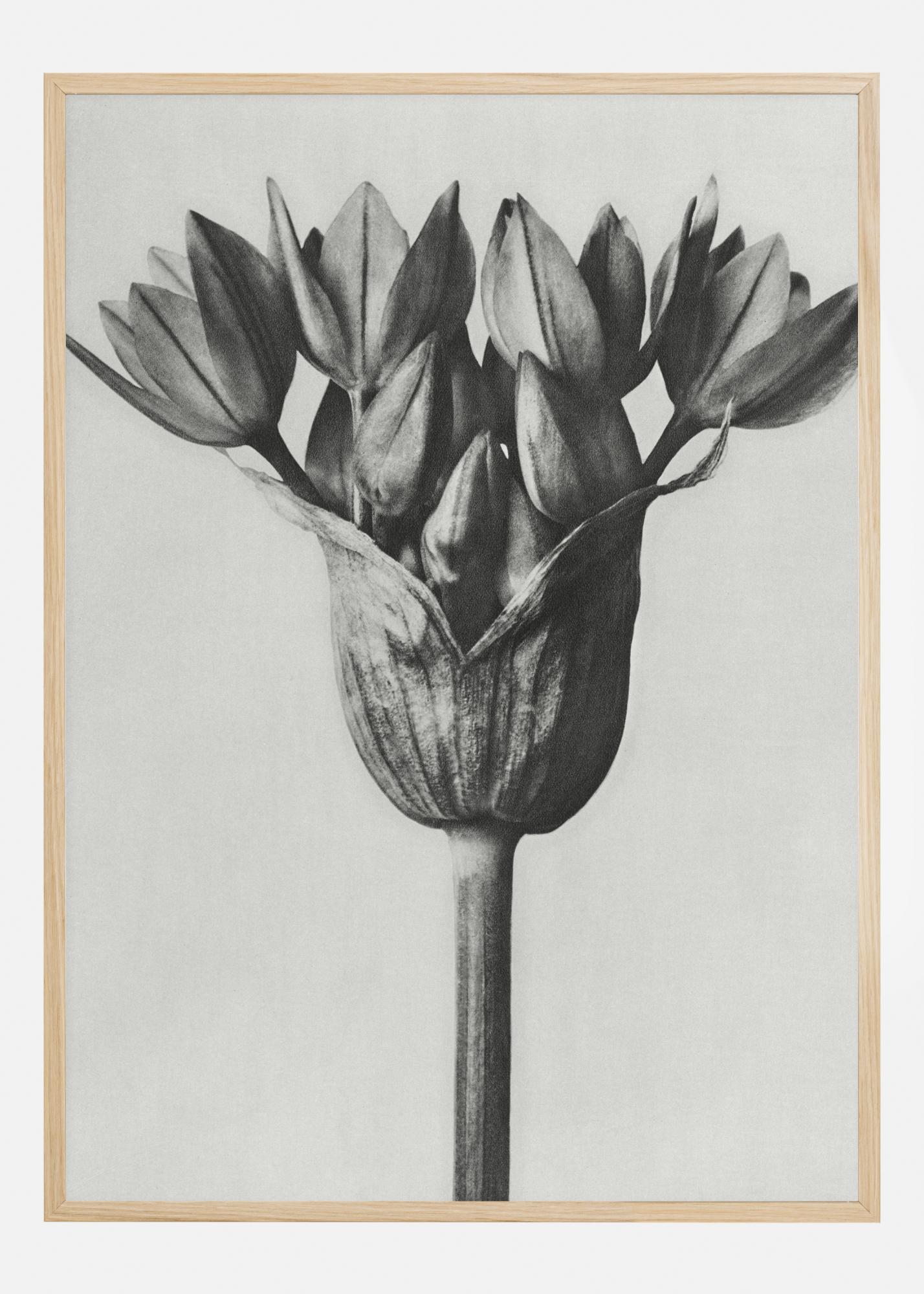 Et vakkert svart-hvitt-bilde med en blomst hvorfra mange mindre blomster kommer ut fra. Den skildrer et symbol på lykke med sin eleganse og enkelhet. Lys- og skyggeeffektene skaper en nydelig utskrift på en enkel grå bakgrunn. Den perfekte plakaten for et romslig område som stuen eller soverommet.