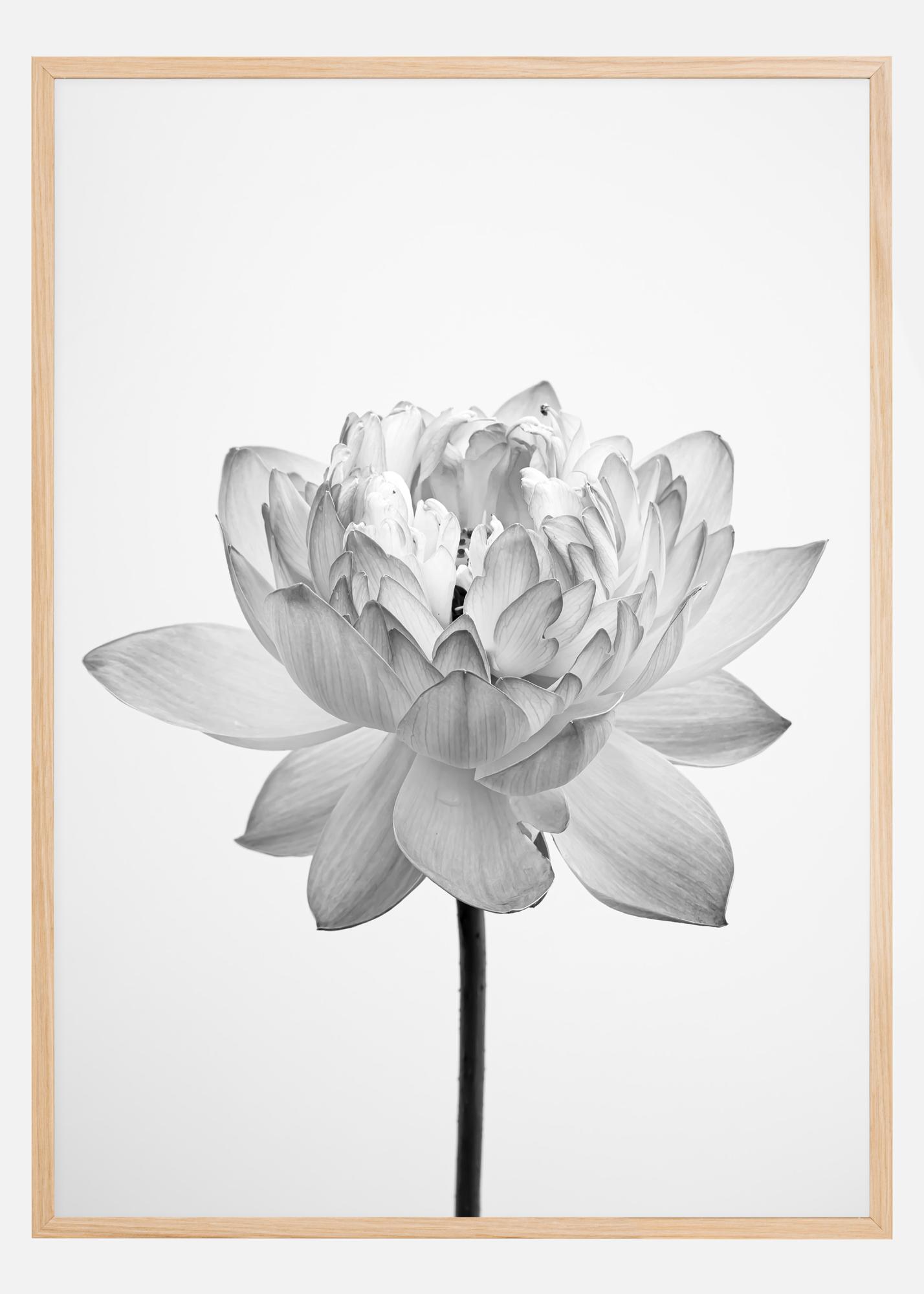 Denne plakaten framstiller et tidløst og elegant svart-hvitt bilde av en blomst i full blomst. Den detaljerte framstillingen av hvert blad viser naturens kunstverk og tilbyr en nesten meditativ betraktning. Dette enkle men kraftfulle bildet er en studie i form, lys og skygge, og hvordan disse elementene samspiller for å fremheve skjønnheten i den naturlige verden.