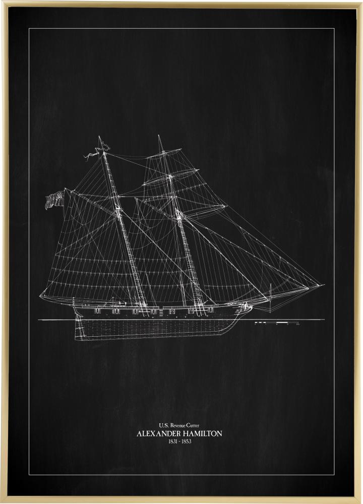 Pryd veggen med en vakker tegning som viser Alexander Hamiltons staselige skip. Denne plakaten etterligner en svart krittavle med et detaljert motiv som ser ut som det er tegnet med et hvitt, tynt kritt. Fartøyets fullstendige navn er United States Revenue Cutter Hamilton. Det elegante skipet ble brukt av den amerikanske kystvakten mellom 1831-1853. Det svarthvite designet gjør seg utmerket sammen med en hvit eller gullfarget ramme. Ettersom plakaten finnes i flere ulike format finner du enkelt en som passer akkurat ditt bruksområde.