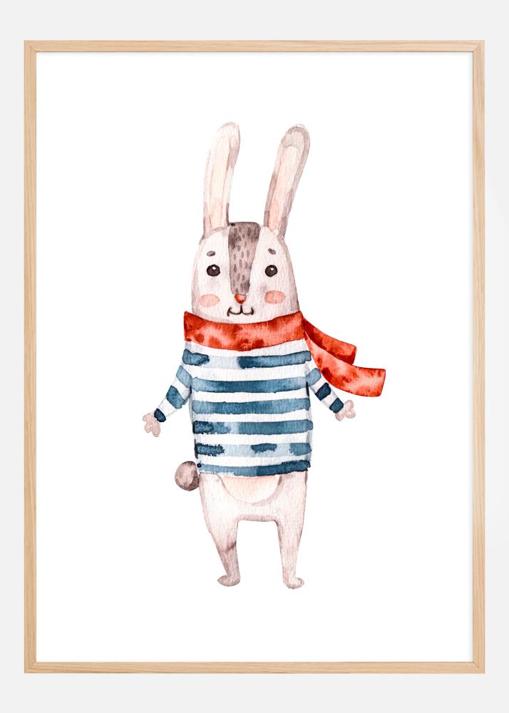 Denne sjarmerende plakaten portretterer en munter kanin kledd i en stripete genser og et flagrende rødt skjerf. Kaninens varme smil og lekne holdning utstråler glede og uskyld, noe som skaper en hjertelig og innbydende følelse. Illustrasjonen, utført i myke akvarelltoner, har en letthet og en enkelhet som gir en gripende og nostalgisk effekt.