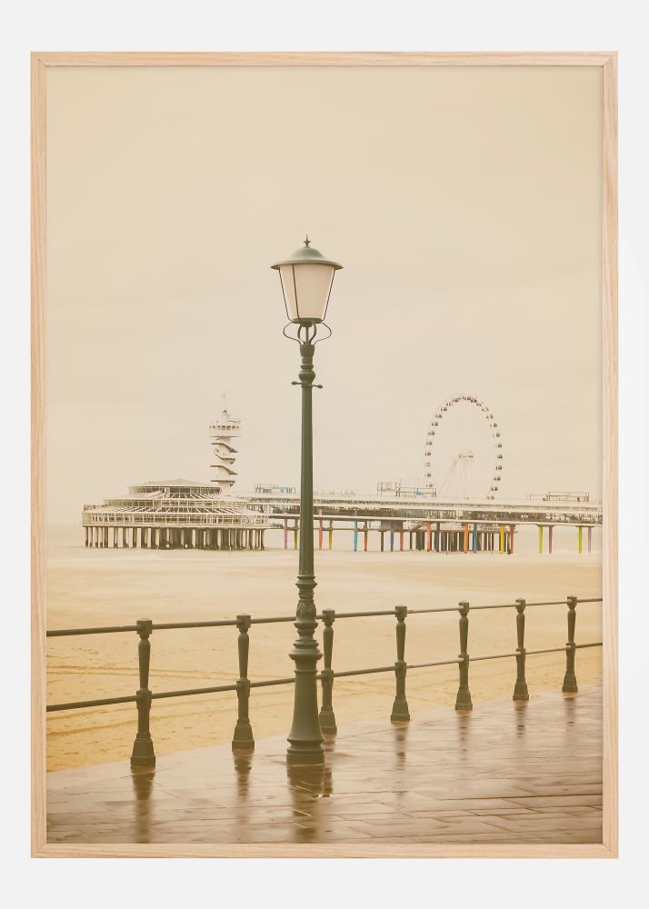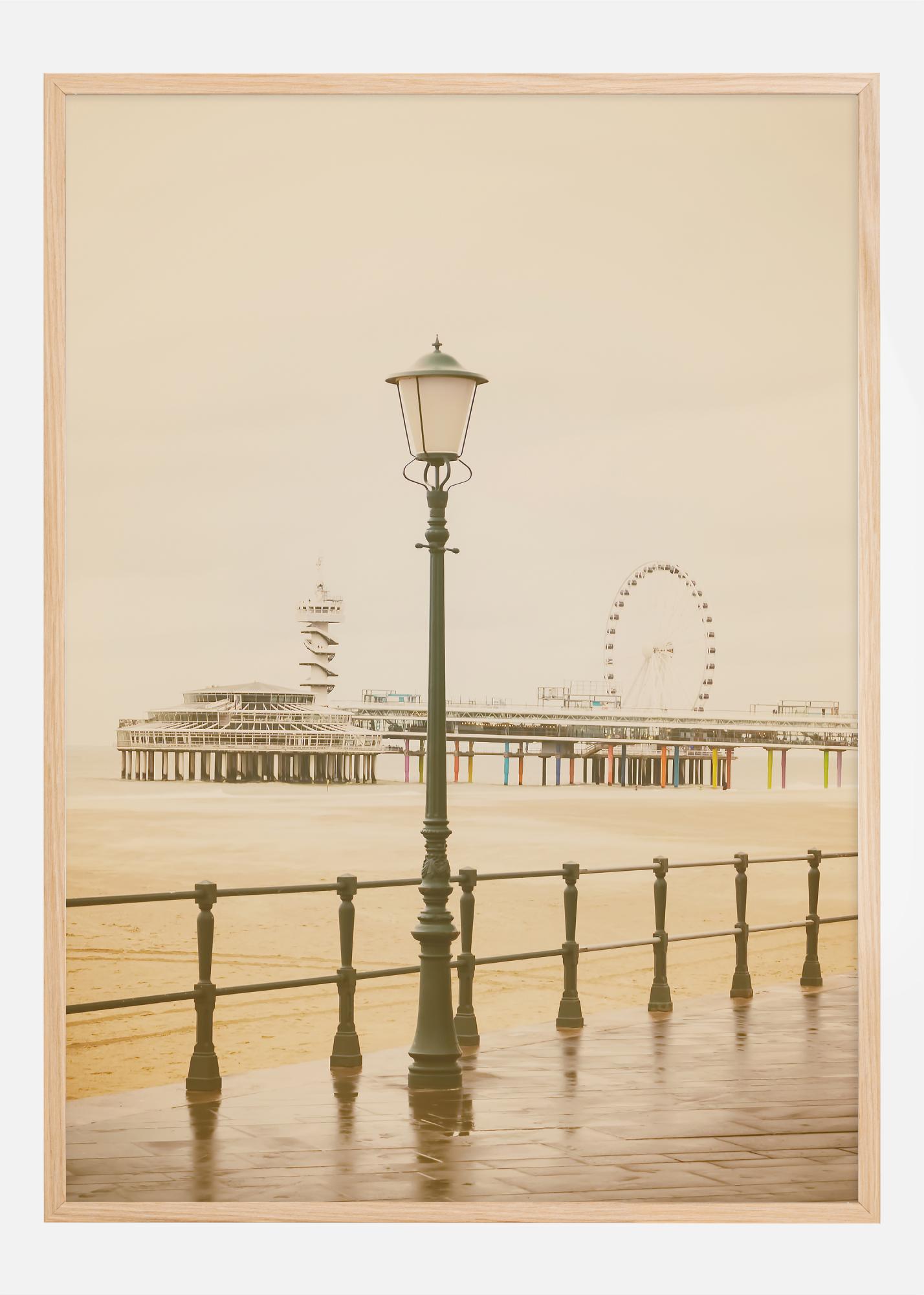 Denne nostalgiske plakaten fremkaller følelsen av en langsom, drømmende dag ved havet. En gammeldags lykt står i forgrunnen, en stille vokter over den tomme strandpromenaden med dens klassiske balustrade. I bakgrunnen sees en brygge med et utsiktstårn og et stort pariserhjul, som tilfører en følelse av tidløs tivolirose. De milde sepia- og beige-tonene forsterker følelsen av en svunnen tid og inviterer til refleksjon.