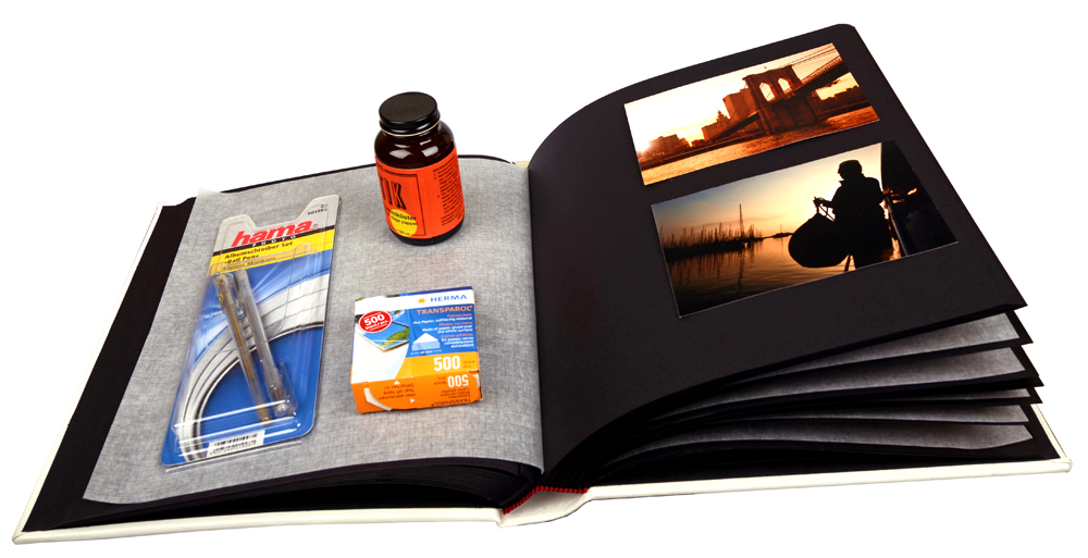 För att montera bilder i albumet behöver du exempelvis Fastik Gummiklister eller fotohörn.