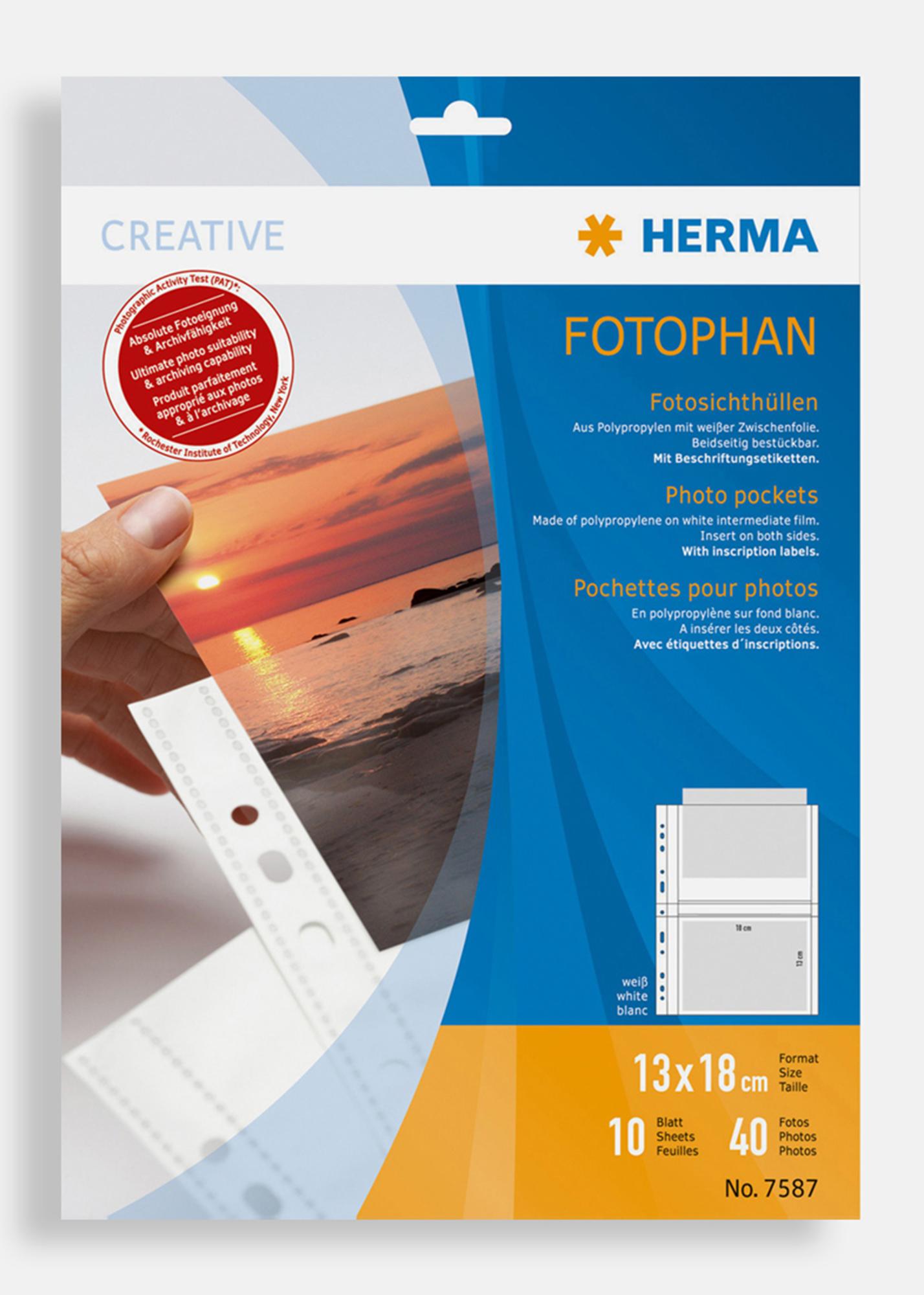 Dobbeltsidige hvite fotolommer for bilder i formatet 13x18 cm (liggende format). Alle fotolommer fra Herma er alltid syrefrie og garantert uskadelige for dine bilder. Fotolommene er tilpasset montering i ringpermer med standard format. Fotolommene er PVC fri.
