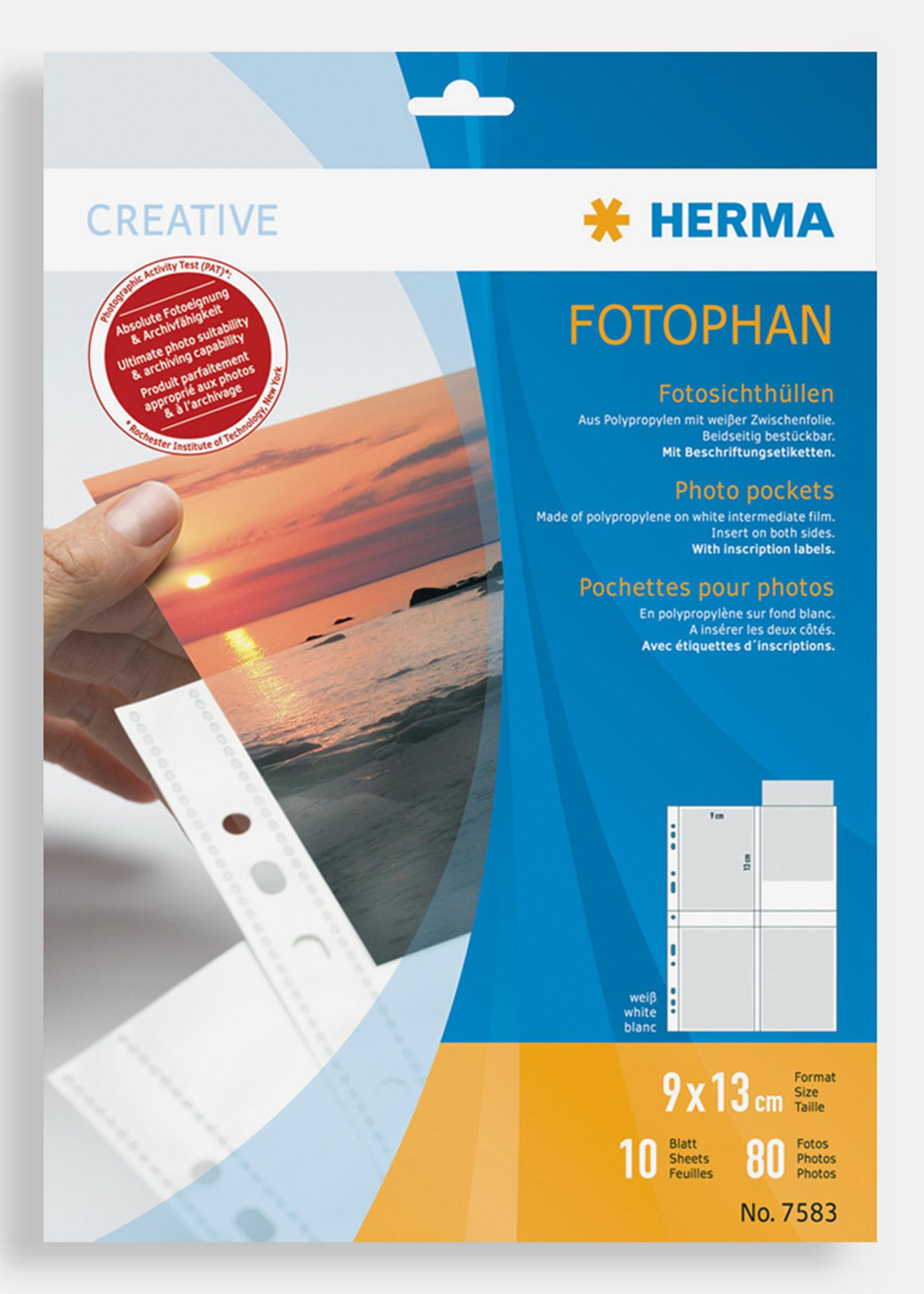 Dobbeltsidige hvite fotolommer for bildet i formatet 9x13 cm (stående format). Alle våre fotolommer fra Herma er alltid PVC frie, syrefrie og garantert uskadelig for dine bilder. Fotolommer er tilpasset montering i ringpermer av standard format.