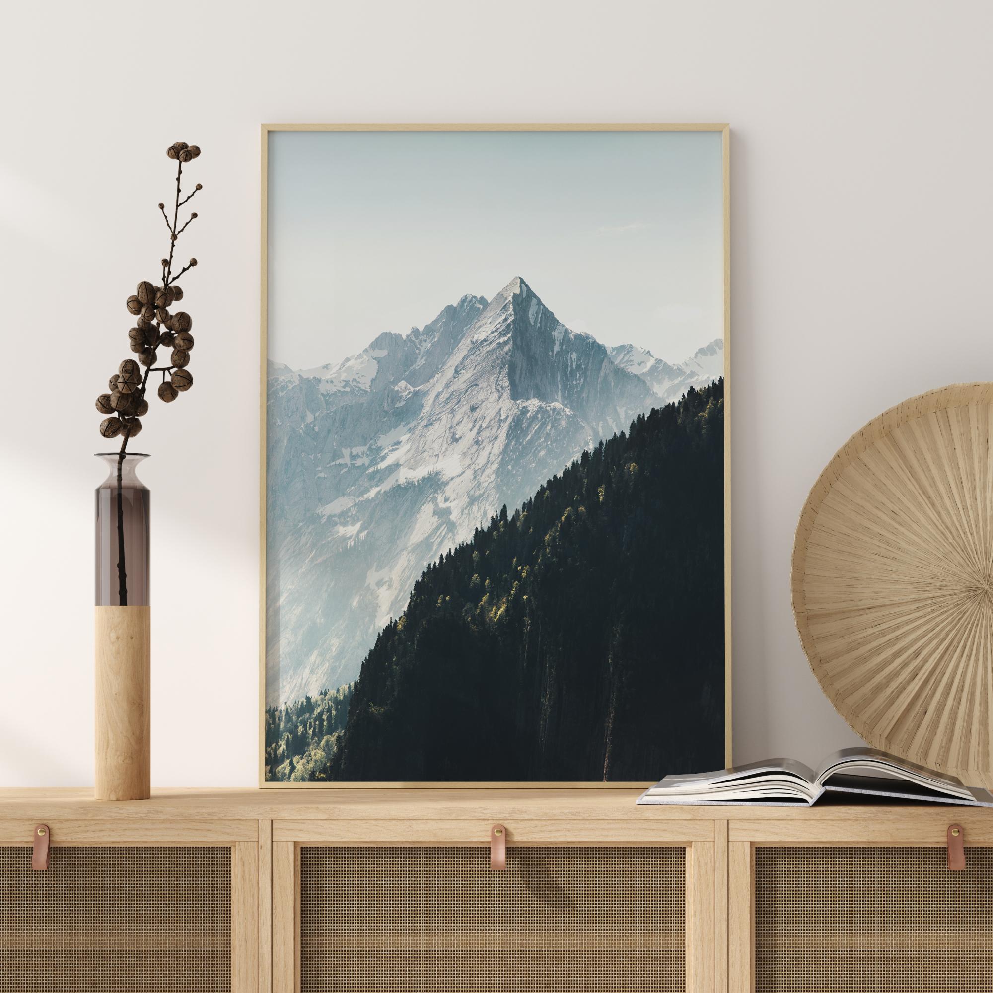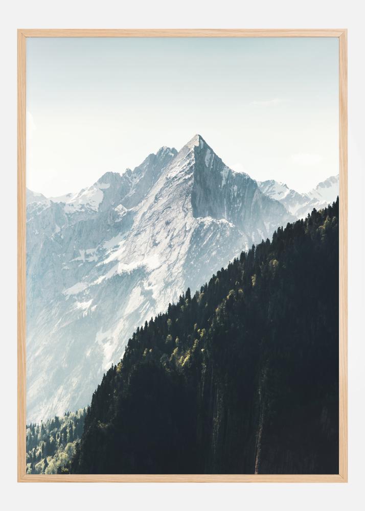 En naturskjønn landskapsscene med snødekte fjell mot en blekblå himmel. I forgrunnen dekker en mørkegrønn skog delvis utsikten over fjellene som skaper en vakker vinteratmosfære. En perfekt plakat å henge over peisen.