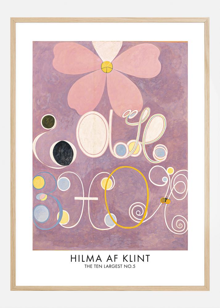 Denne posteren presenterer 'The Ten Largest No.5', en del av Hilma af Klints imponerende serie som utforsker livets ulike stadier med abstrakte og symbolske former. De myke pastelltonene av rosa og kremhvitt skaper en sentral blomst som blir hjertet i dette verket, omgitt av lekfulle spiraler og geometriske former i nyanser av gult, blått og svart mot en lilla bakgrunn. Denne trykken er en hyllest til af Klints revolusjonerende syn og ville lyse opp ethvert rom med sin rolige og balanserende energi.