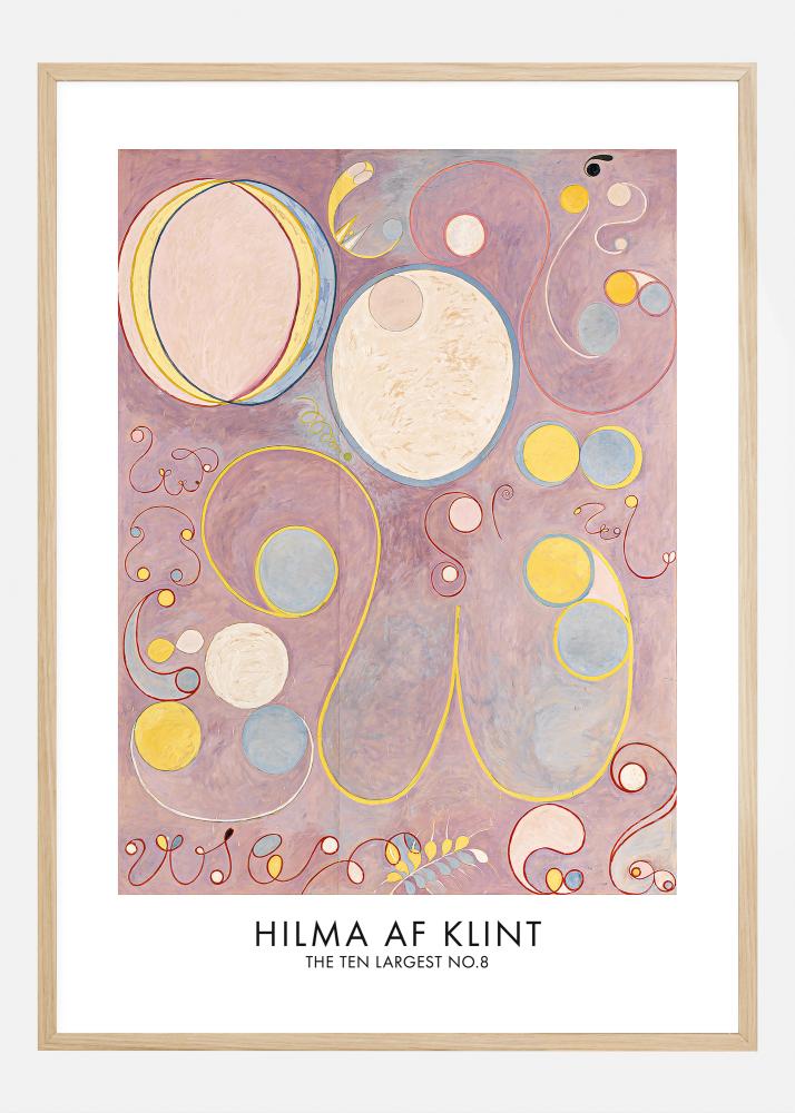 Denne posteren viser 'The Ten Largest No.8', en del av Hilma af Klints bemerkelsesverdige verk som utforsker åndelige dimensjoner gjennom abstrakt kunst. Denne delikate komposisjonen bruker seg av myke pastellfarger og flytende former for å skape en følelse av harmoni og universell balanse. De overlappende sirkel- og spiralformene, fremhevet av linjer i varm rød og gul mot en beroligende rosa bakgrunn, utstråler en omfavnende ro og reflekterende atmosfære. Denne printen er en fantastisk representasjon av af Klints dristige og tidløse visjon, og ville være en inspirerende og meditativ tilvekst til ethvert rom som helst.