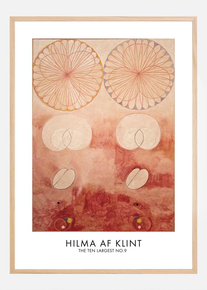 Denne plakaten av 'The Ten Largest No.9' av Hilma af Klint er en hypnotiserende blanding av geometri og organiske former, som illustrerer kunstnerens fascinasjon for det kosmiske og åndelige. De to dominerende sirklene, fylt med strålende linjer på en varm rosa og terrakotta bakgrunn, skaper en umiddelbar visuell attraksjon. Under disse finnes en serie mindre sirkler og spiralformer, som tilfører dybde og kompleksitet til komposisjonen. Denne kunsttrykket er en refleksjon av af Klints evne til å forene vitenskap og åndelighet i en og samme bildeflate, og tilbyr et åpent felt for betrakterens egne tolkninger og indre utforskninger.