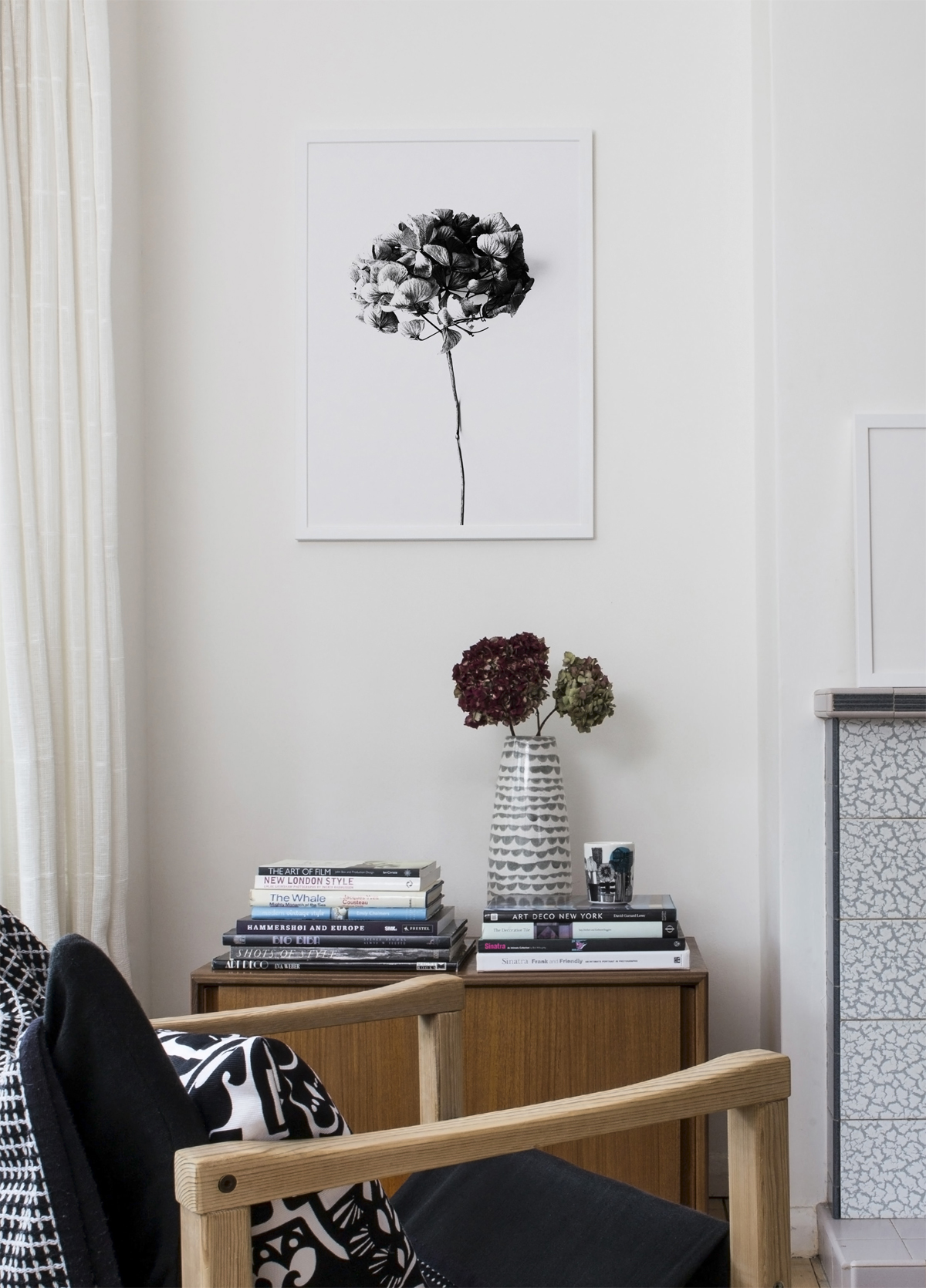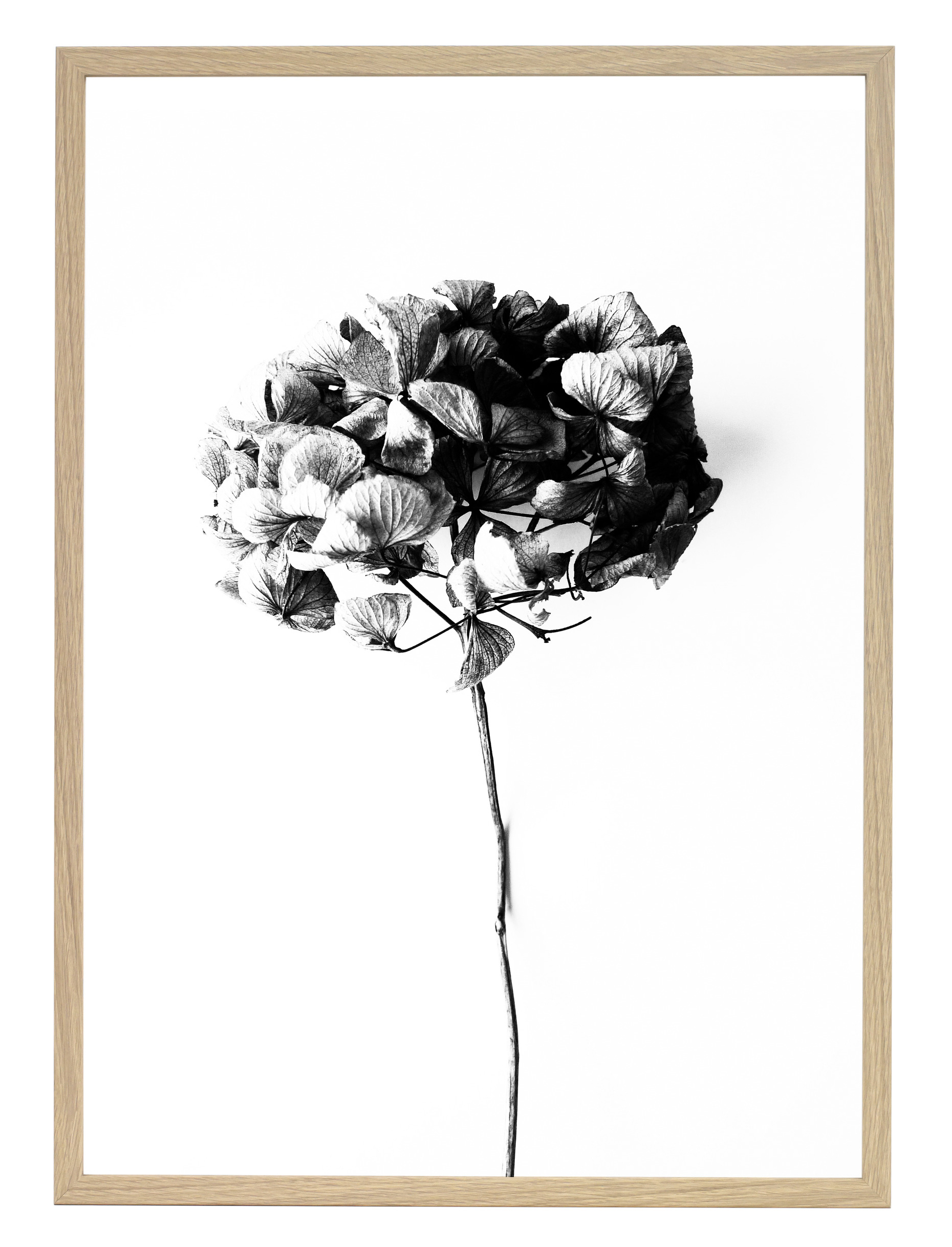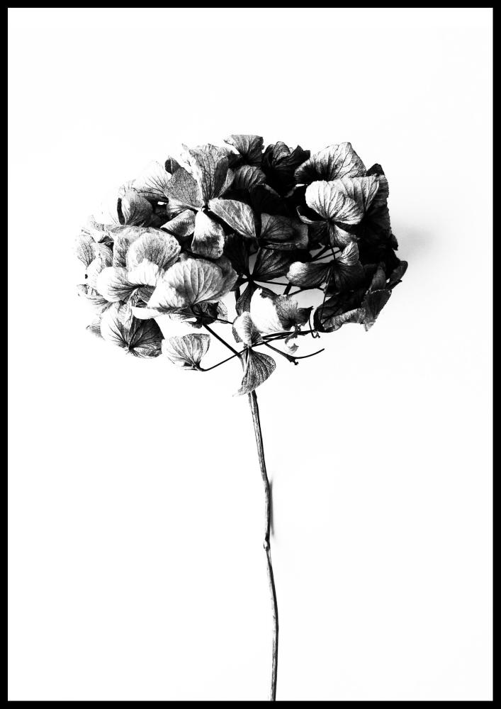 Grafisk plakat med en stilisert blomstrende hortensia i svart på hvitt papir. Blomsterbladenes vakre marmorering kommer tydelig fram i det nydelige bildet. Denne minimalistiske posteren passer fint i alle typer miljø og kan med fordel henges sammen med A Rose is A Rose is A Rose og I do I do I do. Plakaten passer til de fleste typer rammer - monter bildet i en ramme som matcher innredningen for å binde sammen rommet eller velg en hvit eller svart ramme for å fremheve motivet.