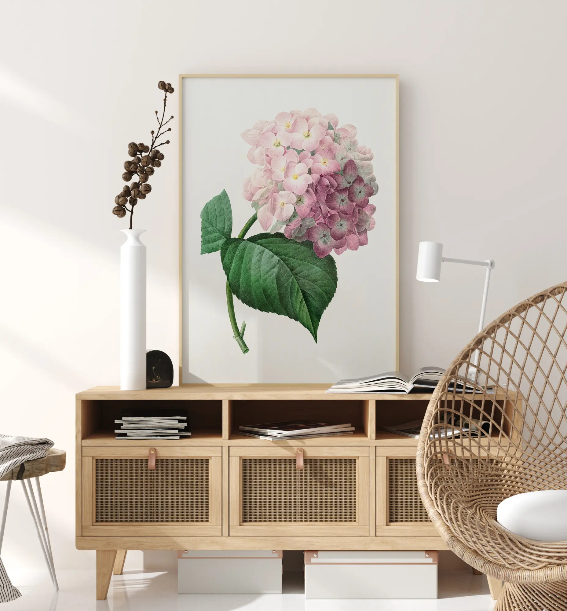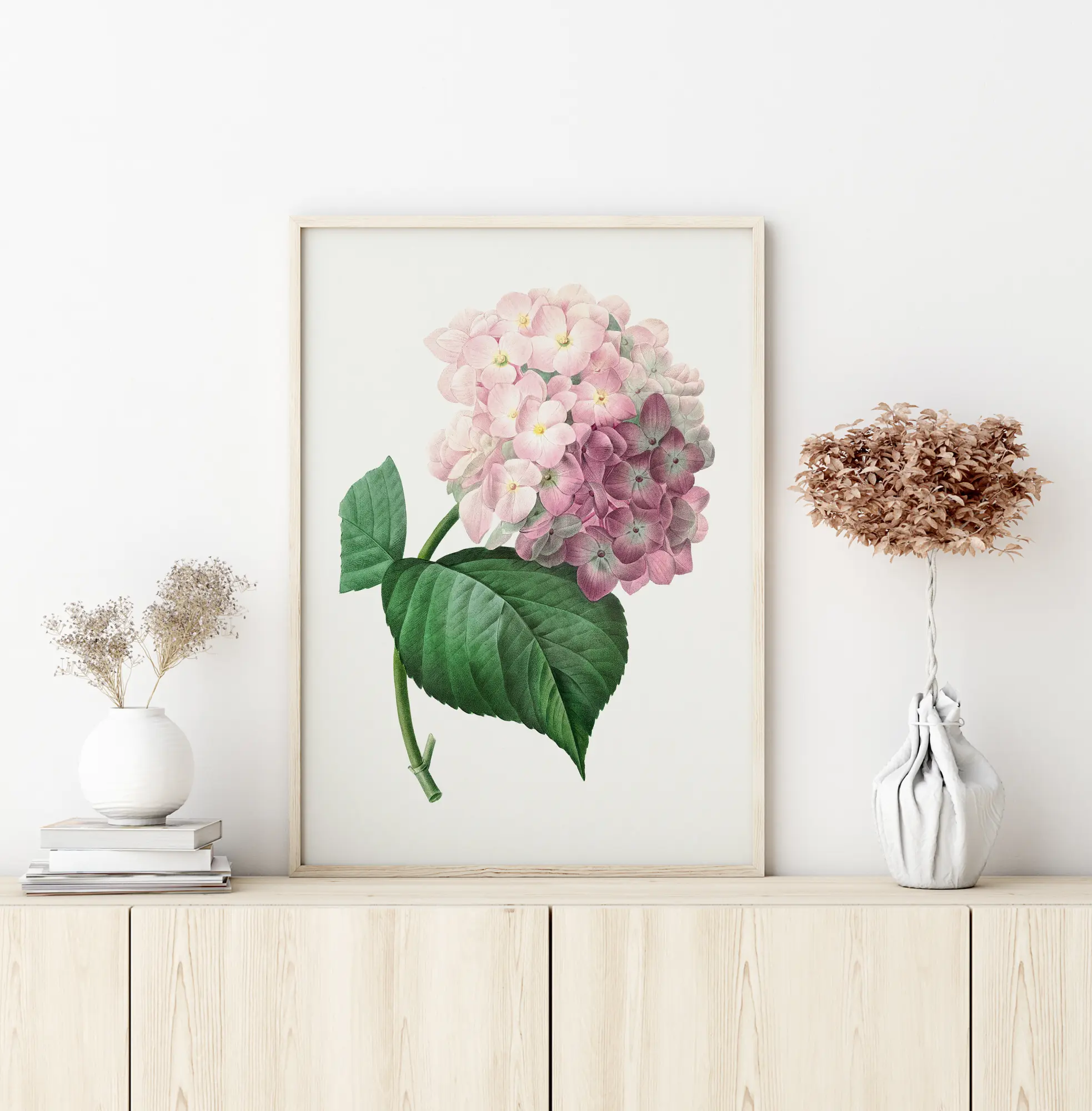 En blomsterplakat med en hortensia. Myke rosa kronblad med en jevn grønn stilk og et grønt blad dominerer bildets senter. Denne vakre, men delikate blomsten uttrykker en følelse av ro på en skarp, hvit bakgrunn. Heng opp plakaten i din vinterhage for et snev av klasse i miljøet.