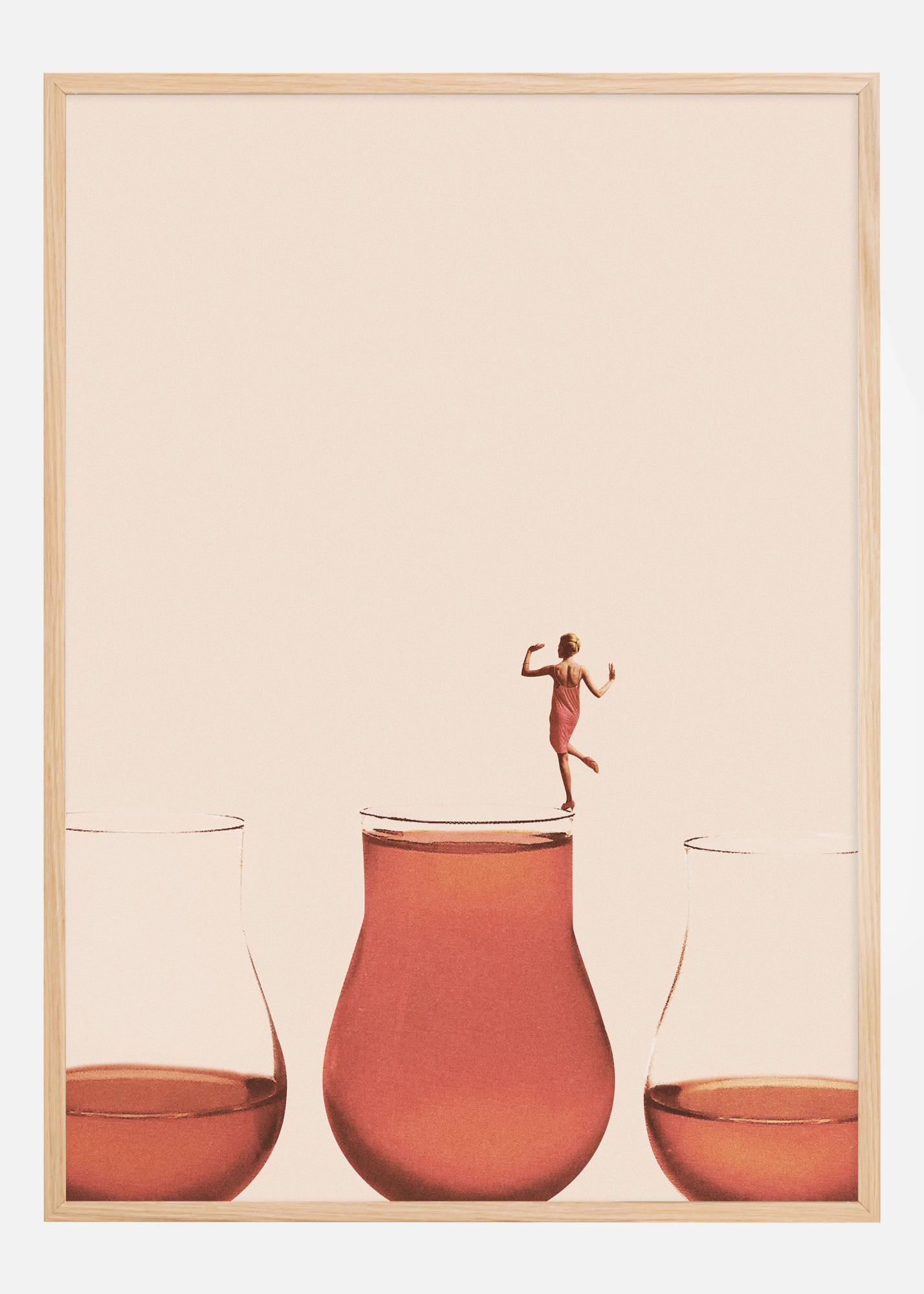 Denne kultiverte og estetisk tiltalende plakaten forestiller en kvinnelig figur som utfører en delikat balansegang på kanten av et overfylt vinglass. Kvinnen, kledd i en kjole, ser ut til å danse eller bevege seg med en edel eleganse, et bilde av kontroll og presisjon i en handling som kan virke risikabel. Hennes silhuett fremstår nesten som en metafor for den finstemte tilnærmingen som kreves for å nyte livets finere ting, med en balansert verdsettelse for det fulle og det tomme.