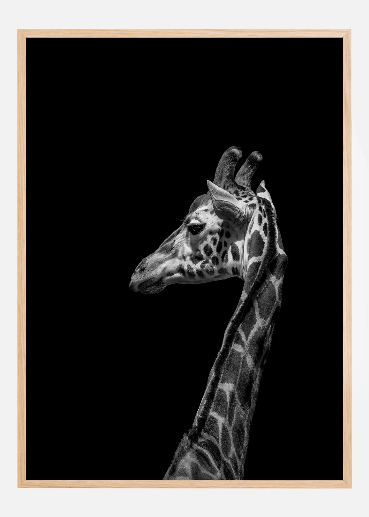 Denne dristige og uttrykksfulle plakaten presenterer en staselig giraff mot en kullsvart bakgrunn, noe som skaper en dramatisk kontrast som fanger betrakterens blikk. Giraffens unike mønster i gråtoner er dyktig fanget, med hver flekk og linje fremhevet i detalj. Detaljrikdommen i giraffens hudtekstur og de myke nyansene av grått mot den svarte bakgrunnen gir en nesten tredimensjonal effekt.