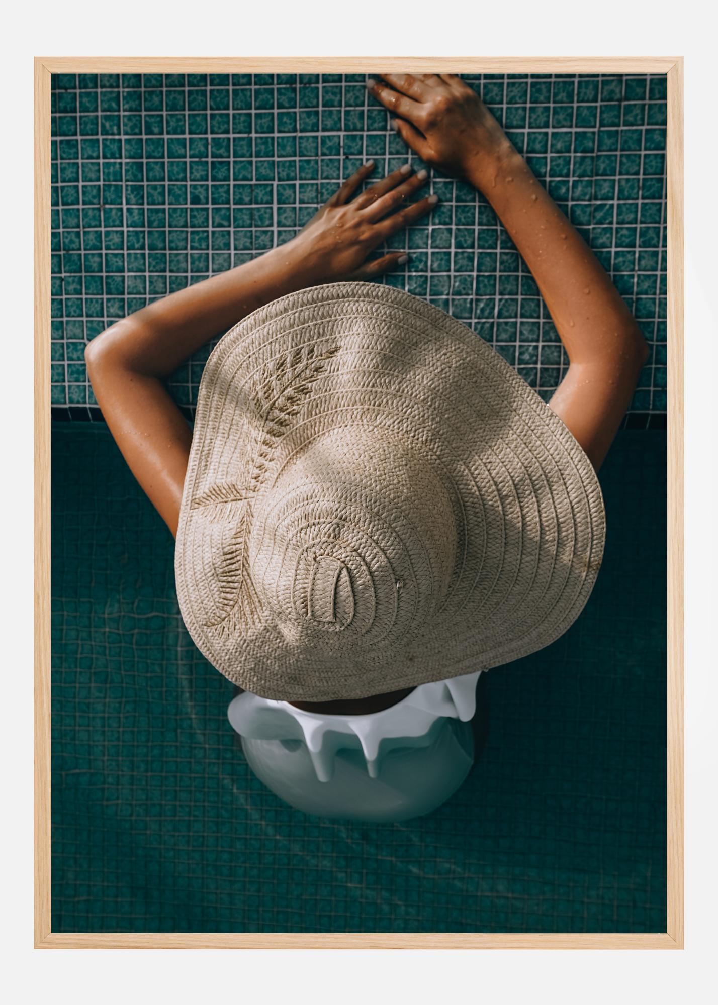 Denne avslappende og elegante posteren fanger et fredelig øyeblikk ved bassenget, hvor en person med en bredbremmet hatt hviler ved vannkanten. Den unike utsikten ovenfra og den beroligende blå mosaikkbakgrunnen gir en følelse av luksuriøs letthet og sofistikasjon. Denne plakaten er en fantastisk interiørdetalj for å skape en oase av ro og avslapning i ditt hjem.