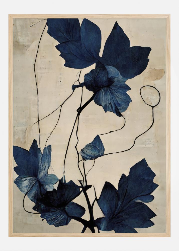 Denne plakaten fanger en fascinerende botanisk skjønnhet med dens detaljerte og realistiske fremstilling av blomster i dyp indigoblå farge. Bladenes og blomsternes intense og mørke nyanser står i kontrast mot en aldrende papirliknende bakgrunn, noe som gir en antikk og tidløs følelse. Denne trykken er en hyllest til klassisk botanisk illustrasjon og gir et elegant og sofistikert inntrykk i hvilket som helst rom den plasseres i.