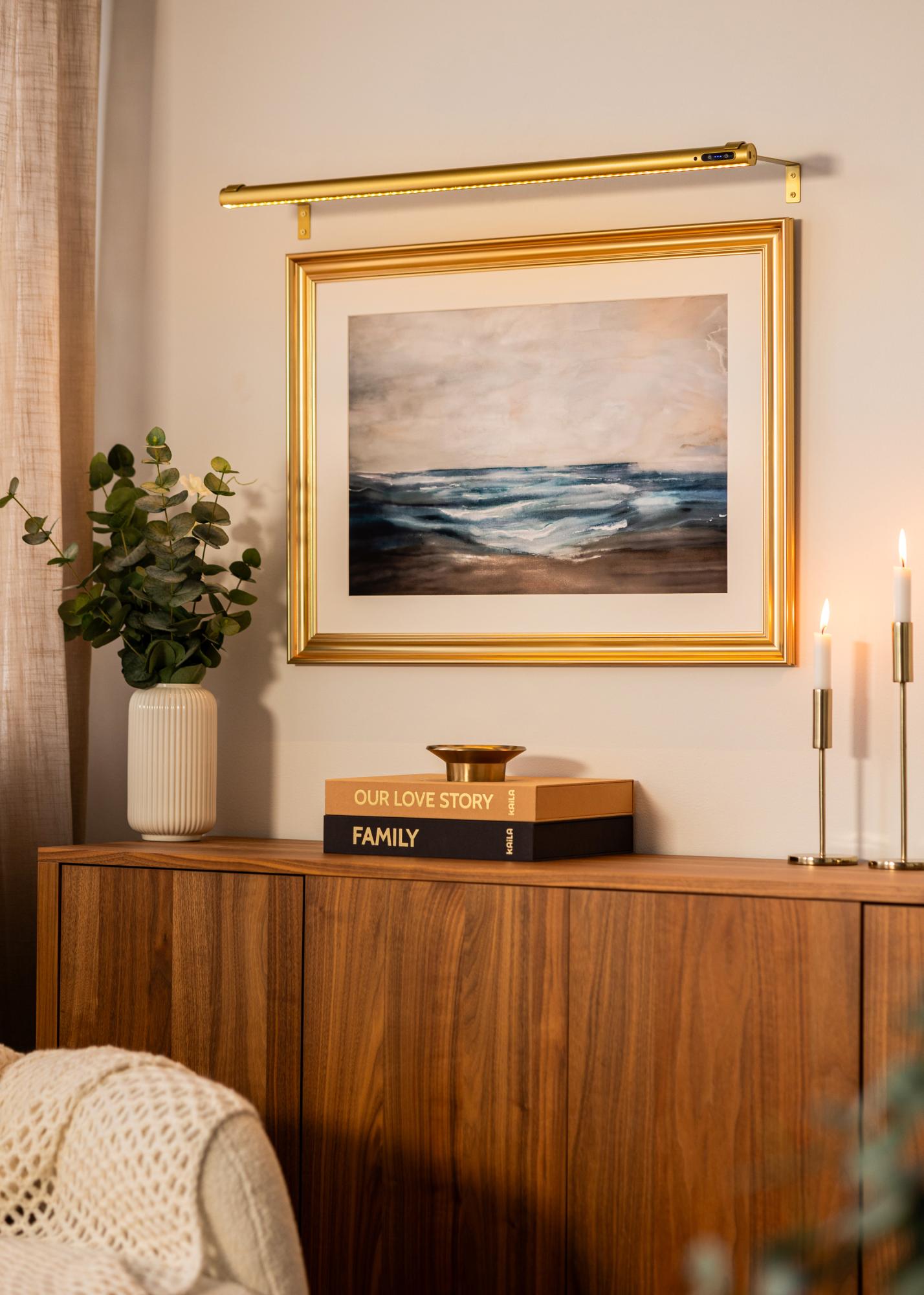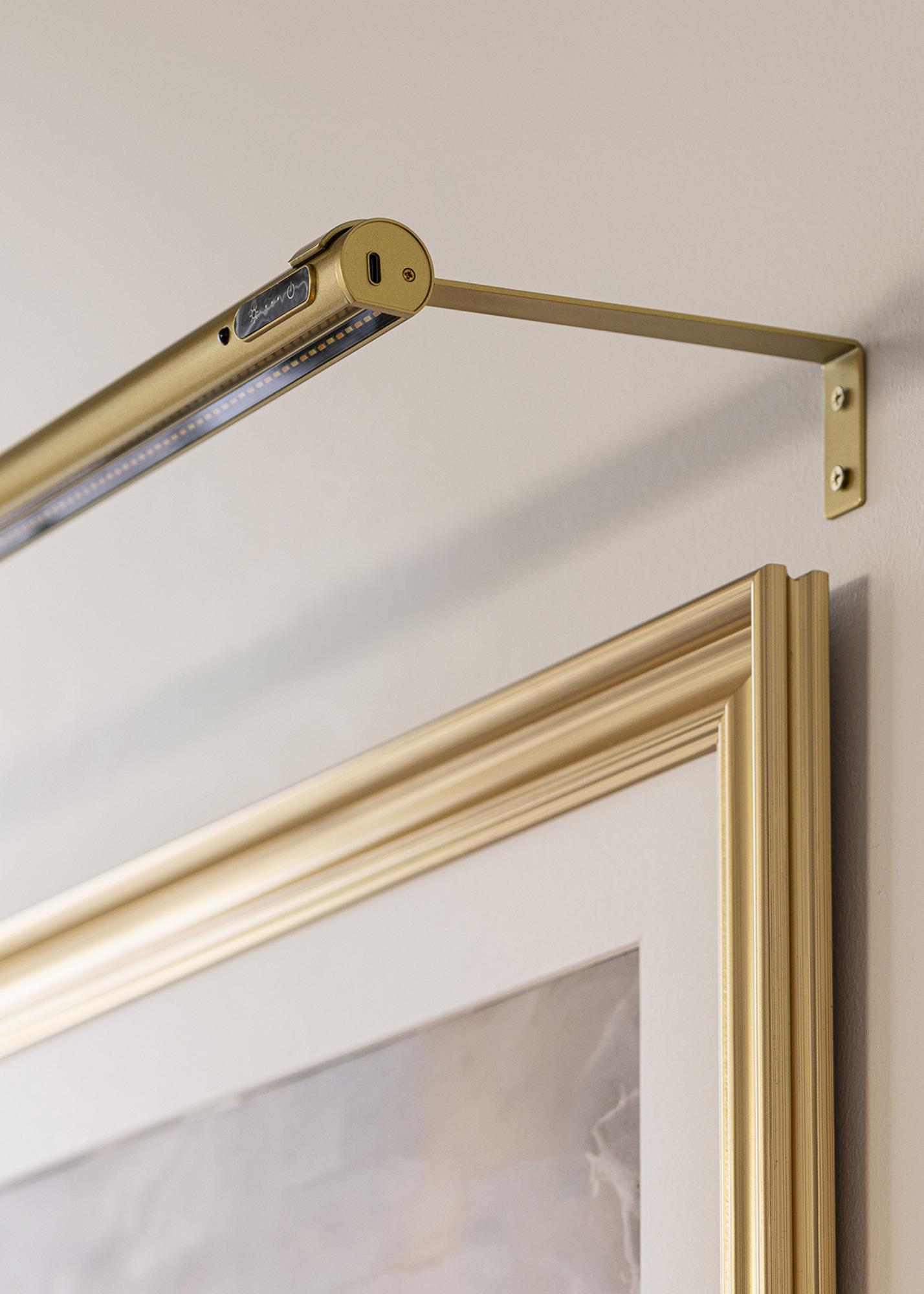 Fremhev dine kunstverk med KAILA Brilliance – en stilren og batteridrevet bildearmatur som gir bildet ditt perfekt belysning uten ledninger! Takket være dens ledningsfrie design kan den enkelt plasseres hvor som helst uten å ta hensyn til stikkontakter. Med sin elegante gullfinish og justerbare arm sprer den et mykt og jevnt lys over bildet ditt, som fremhever detaljer og farger på en vakker måte. Enkel montering og smidig bruk gjør denne bildearmaturen til et utmerket valg for både hjem og galleri.