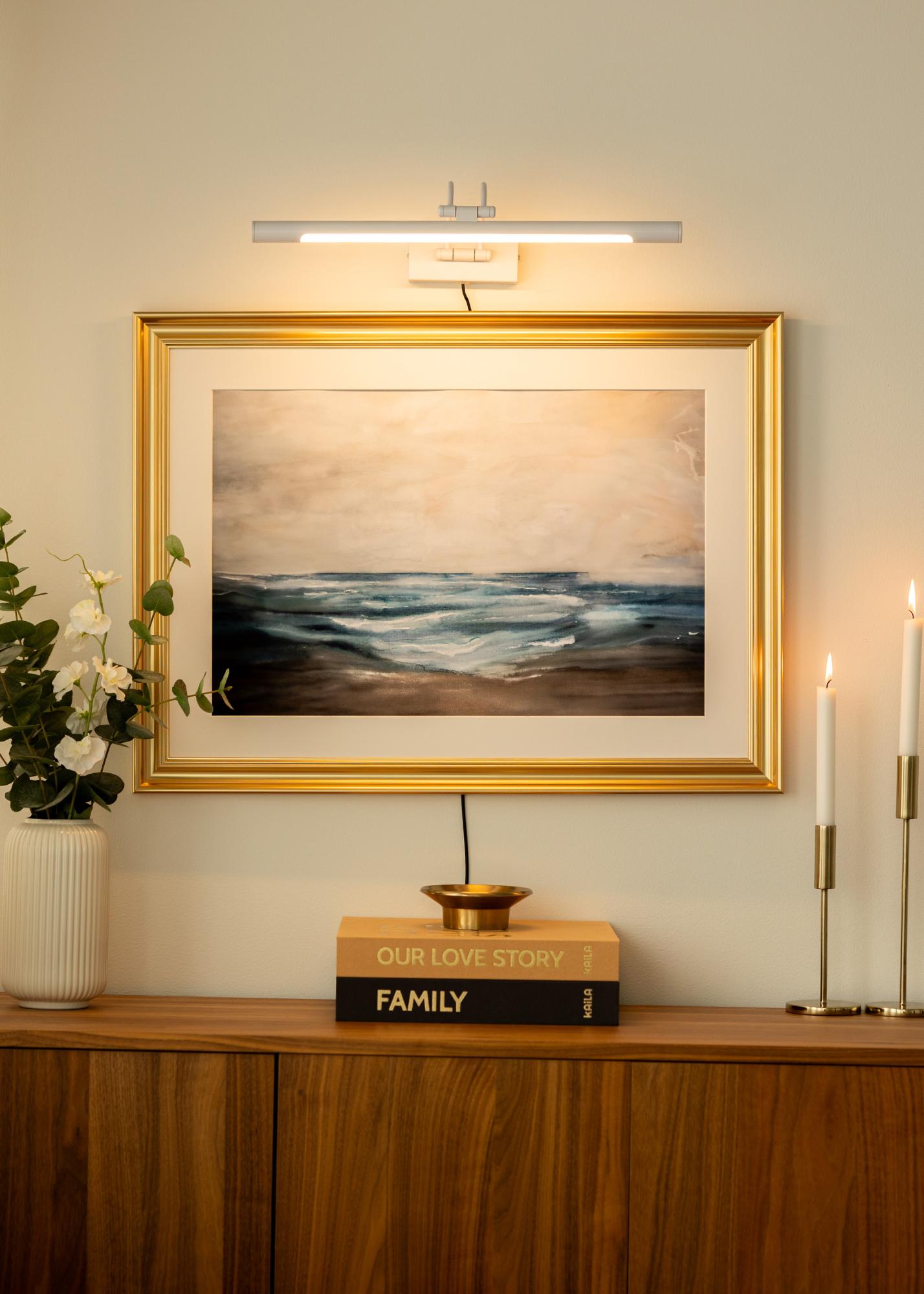 Med den praktiske dimmerfunksjonen kan du enkelt justere lysstyrken avhengig av tid på dagen eller den atmosfæren du ønsker å skape. Med en lysstyrke på 520 lumen gir belysningen et jevnt og behagelig lysflyt over hele overflaten, noe som gjør at kunstverket fremheves på en subtil men effektiv måte. Denne fleksibiliteten gjør det mulig å skape riktig stemning, enten du ønsker et mykt skinn om kvelden eller en mer opplyst visning på dagen.