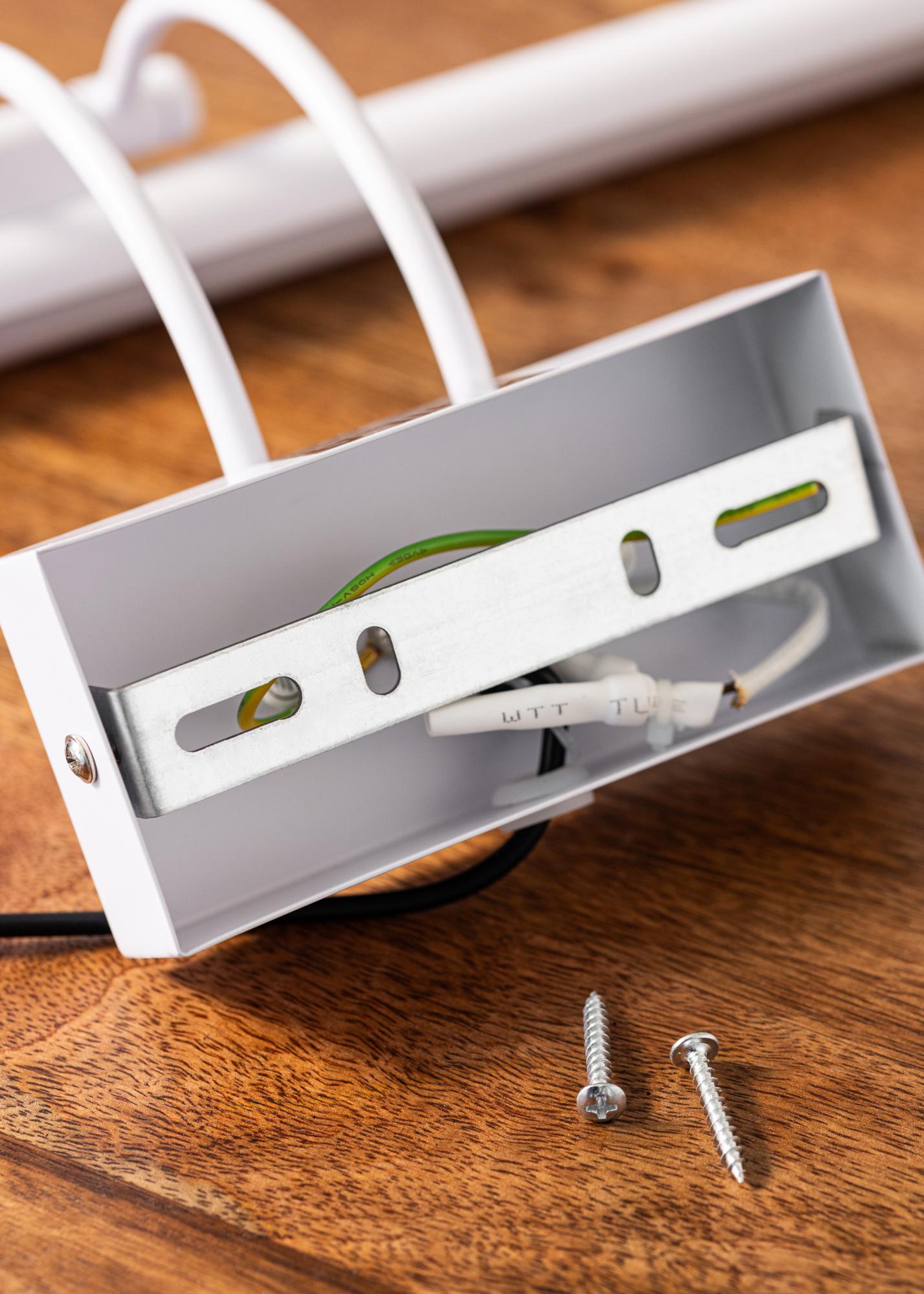Denne bilde-belysningen i hvit finish er et stilrent alternativ for å gi dine kunstverk et behagelig og fokusert lys. Med en dybde på 19 cm og en lengde på 50 cm, passer den utmerket for bilder med en maksimal bredde på opptil 90 cm. Den innebygde LED-lyskilden tilbyr en fargetemperatur på 3000K, som skaper et varmt og innbydende lys som forsterker detaljene i din kunst uten å dominere rommet.