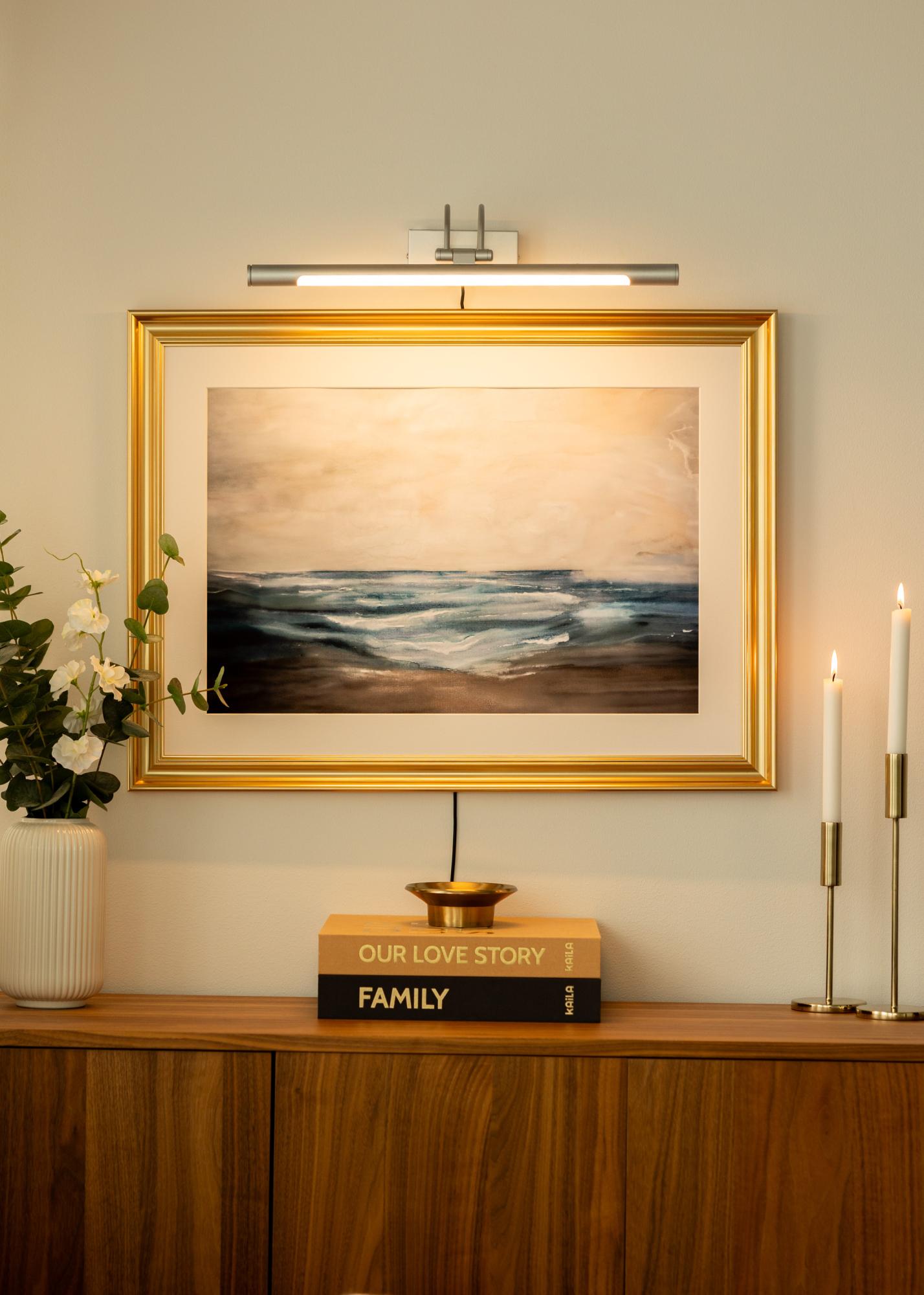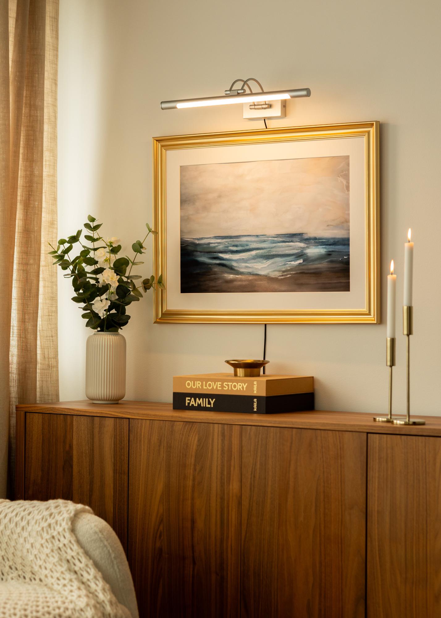 En elegant bilde belysning i sølv som diskret fremhever dine kunstverk. Med sine mål på 19 cm i dybde og 50 cm i lengde passer den perfekt for bilder med en maksimal bredde på opptil 90 cm. Lyset har en fargetemperatur på 3000K, noe som gir et varmt, innbydende skjær som skaper en behagelig atmosfære uten å dominere rommet.