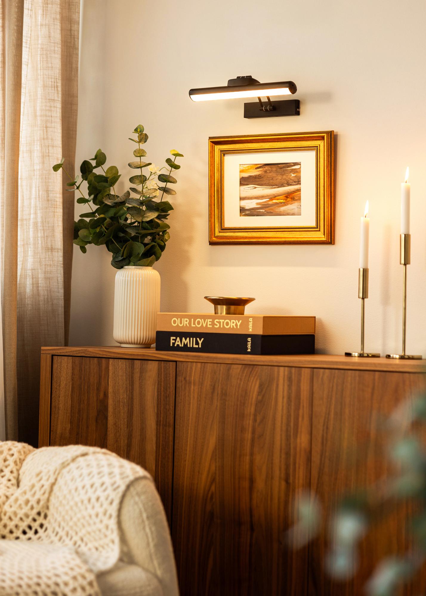 KAILA Lysekrone er en elegant og batteridrevet bildearmatur i svart, perfekt for å fremheve dine bilder uten forstyrrende ledninger. Takket være den trådløse designen kan du montere lampen enkelt og fritt uten å måtte tenke på stikkontakter. Den stilrene svarte finishen gir et moderne og sofistikert uttrykk, mens det jevne lyset skaper en vakker belysning av kunsten din. Enkel å installere og smidig å bruke – en praktisk løsning for å gi dine bilder den oppmerksomheten de fortjener.