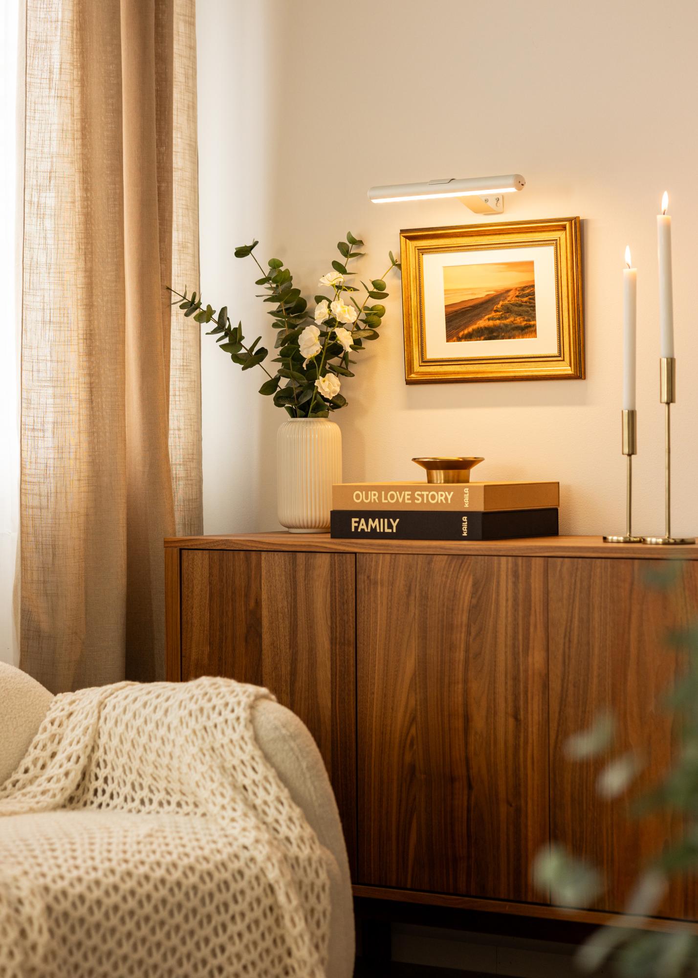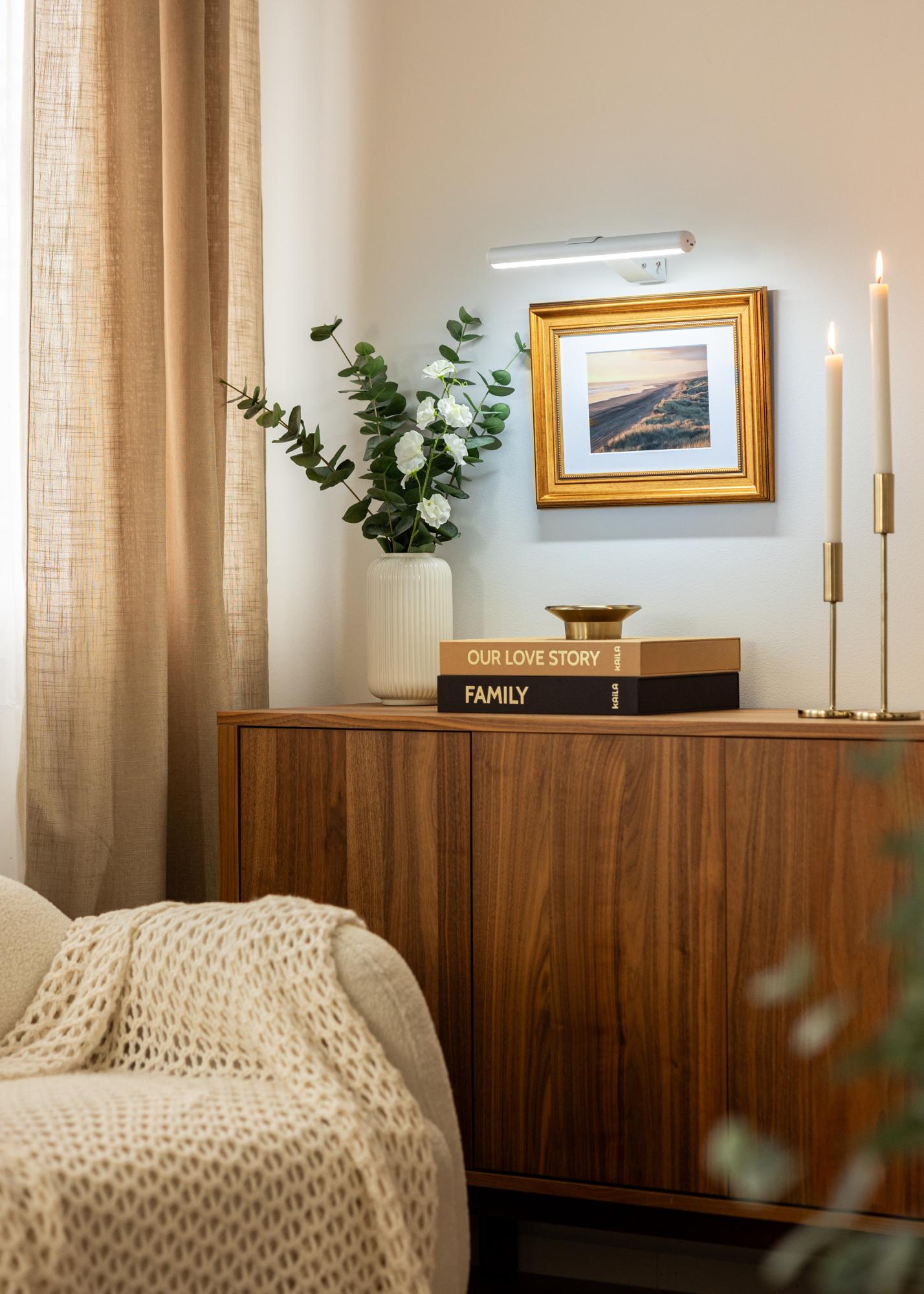 Denne batteridrevne bildebelysningen i hvit design tilbyr en smidig løsning for å belyse kunstverkene dine uten behov for å trekke kabler. Takket være at den drives med batteri, kan den plasseres på et hvilket som helst sted uten å tenke på stikkontakter, noe som gjør den veldig fleksibel. Med en dybde på 15 cm og en lengde på 33 cm er belysningen kompakt og enkel å installere, samtidig som den kan lyse opp kunstverk med en bredde på opptil 60 cm.