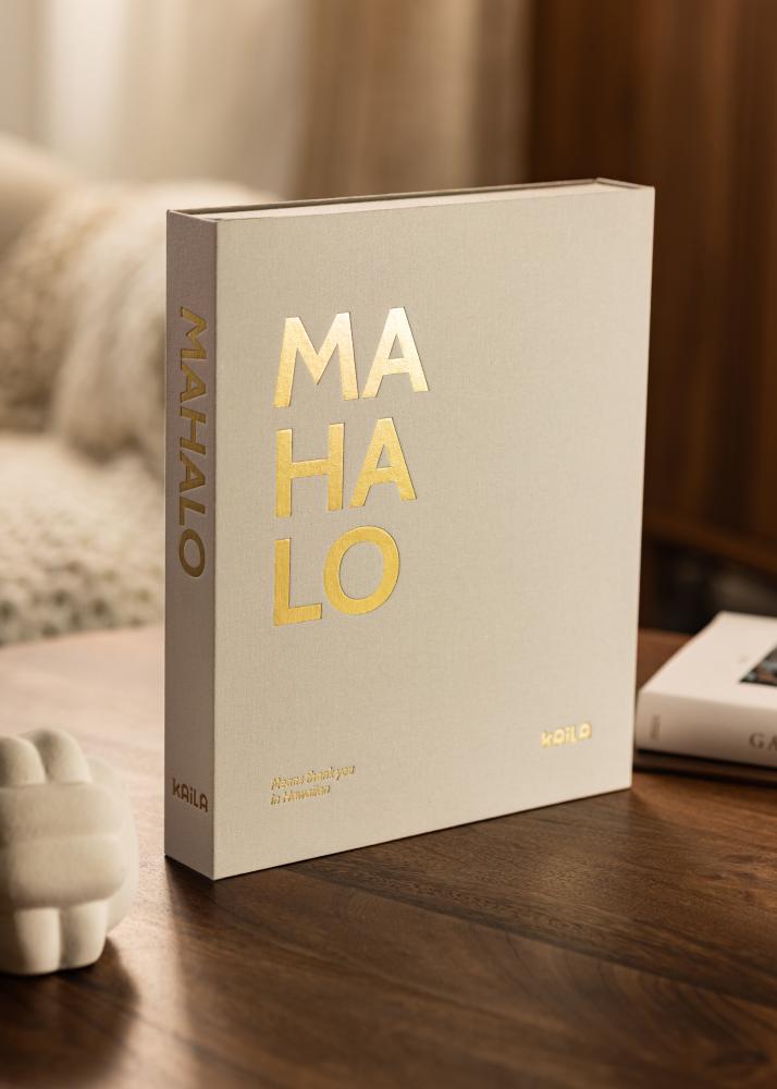 Med denne Coffee Table Book får du et praktisk fotoalbum og en fin interiørdetalj i en og samme pakke! Albumet er utformet som en eksklusiv eske, med grått tekstilomslag og gullfarget trykk hvor det står "MAHALO". I albumets venstre hjørne står undertittelen "Means thank you in Hawaiian". Det klassiske uttrykket gjør at dette Coffee Table Albumet passer perfekt i bokhyllen eller på stuebordet.