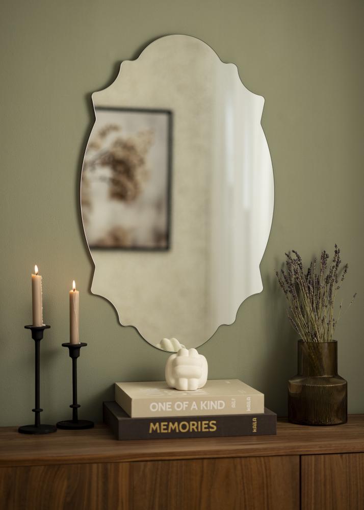Speil fra KAILA, med vakker bølget form for et ekstra elegant inntrykk. Dette veggspeilet er en perfekt interiørdetalj på soverommet eller i stuen takket være det tidløse designet. Speilet har en klassisk stil med tynt ufarget speilglass og et veggfeste som gir enkel opphengning. Dette speilet har en størrelse på 50x80 cm.