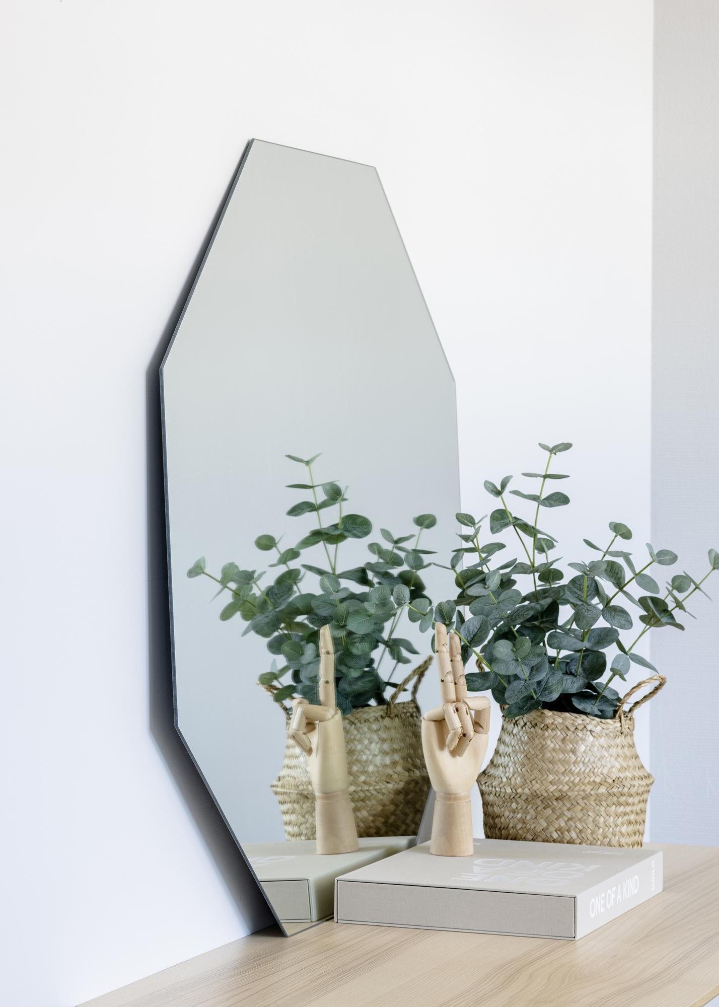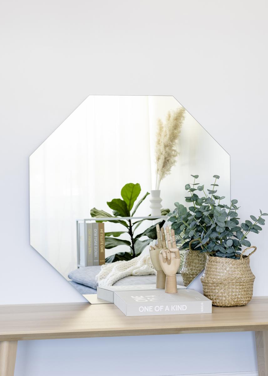 Dette fine speilet fra KAILA er perfekt i stuen, gangen eller på soverommet. Den åttekantede formen uten ramme gir perfekt balanse mellom minimalisme og glamour. Gjennom å innrede med forskjellige former og materialer kan du skape en dynamikk i hjemmet, og dette kantete speilet gir en fin kontrast til andre møbler og interiørdetaljer. Speilet har et veggfeste og kan enkelt henges opp på veggen.