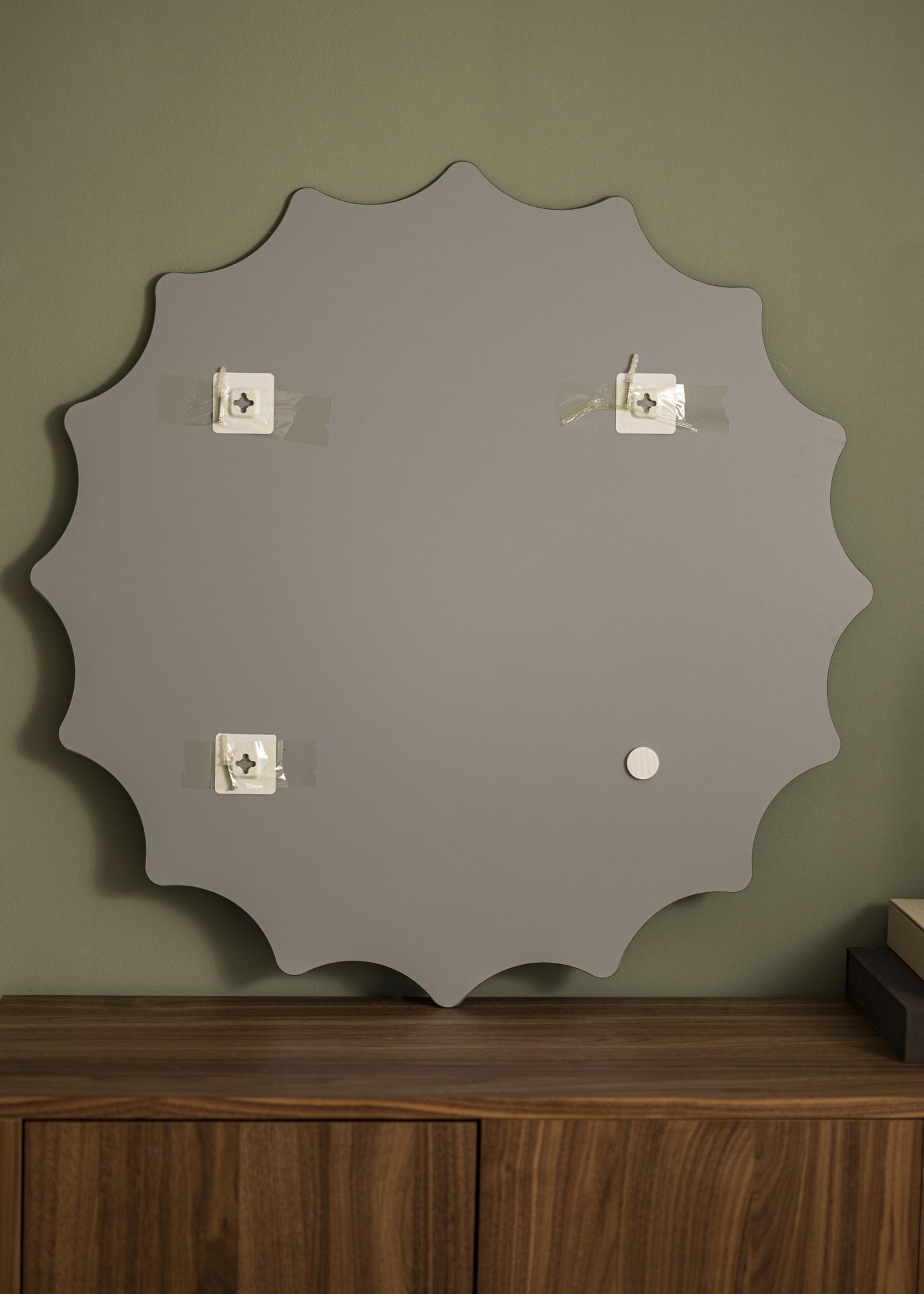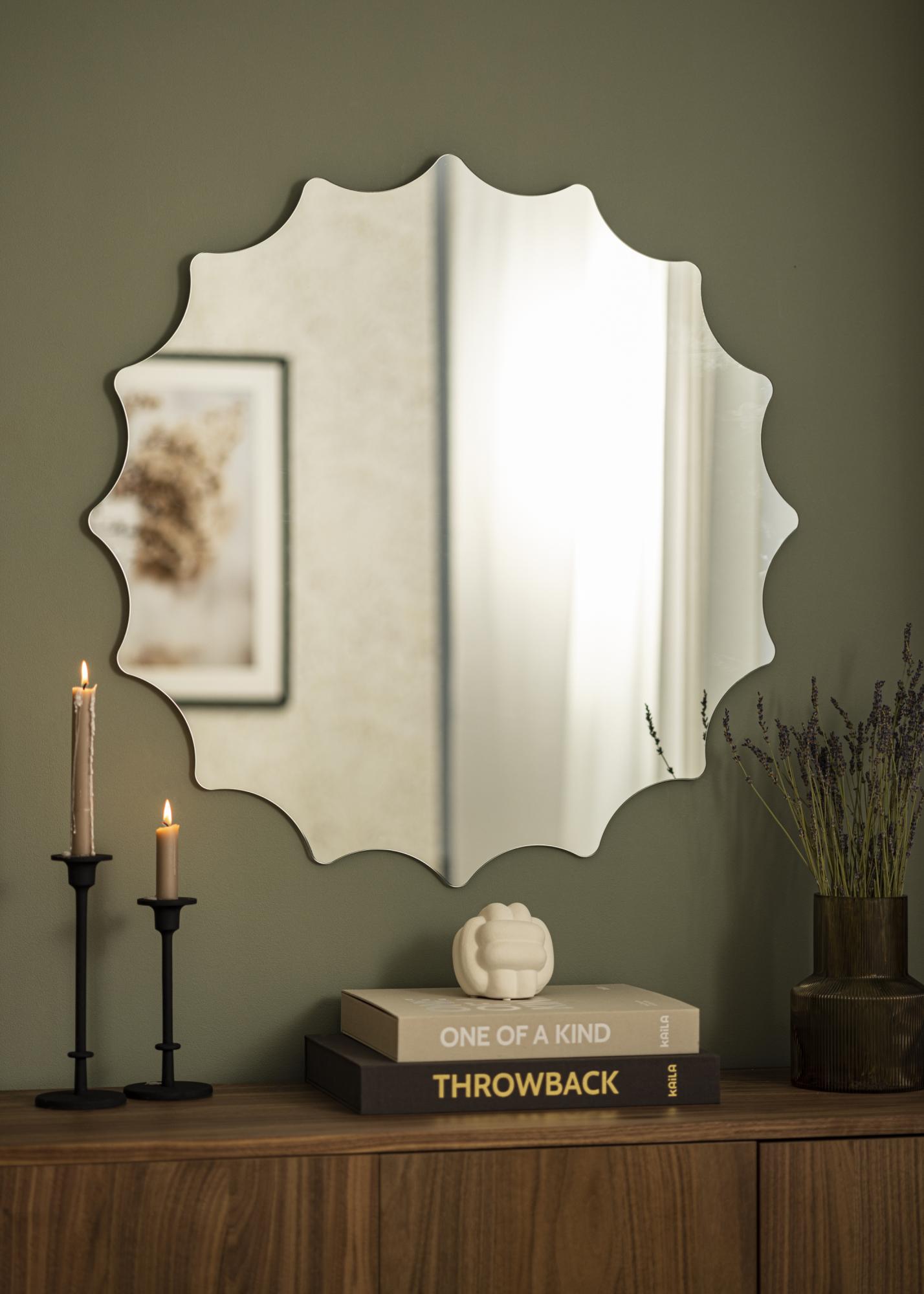 Pent speil fra KAILA i en leken form som passer perfekt til det kreative hjemmet. Det solformede designet gir et spennende inntrykk samtidig som det tynne og ufargede glasset beholder den klassiske følelsen. Veggspeilet har ikke ramme, noe som forsterker elegansen enda mer. La deg inspirere av den bølgende formen og plasser speilet på veggen i gangen, på soverommet eller i stuen ved hjelp av det praktiske veggfestet. Speilet har en diameter på 80 cm.