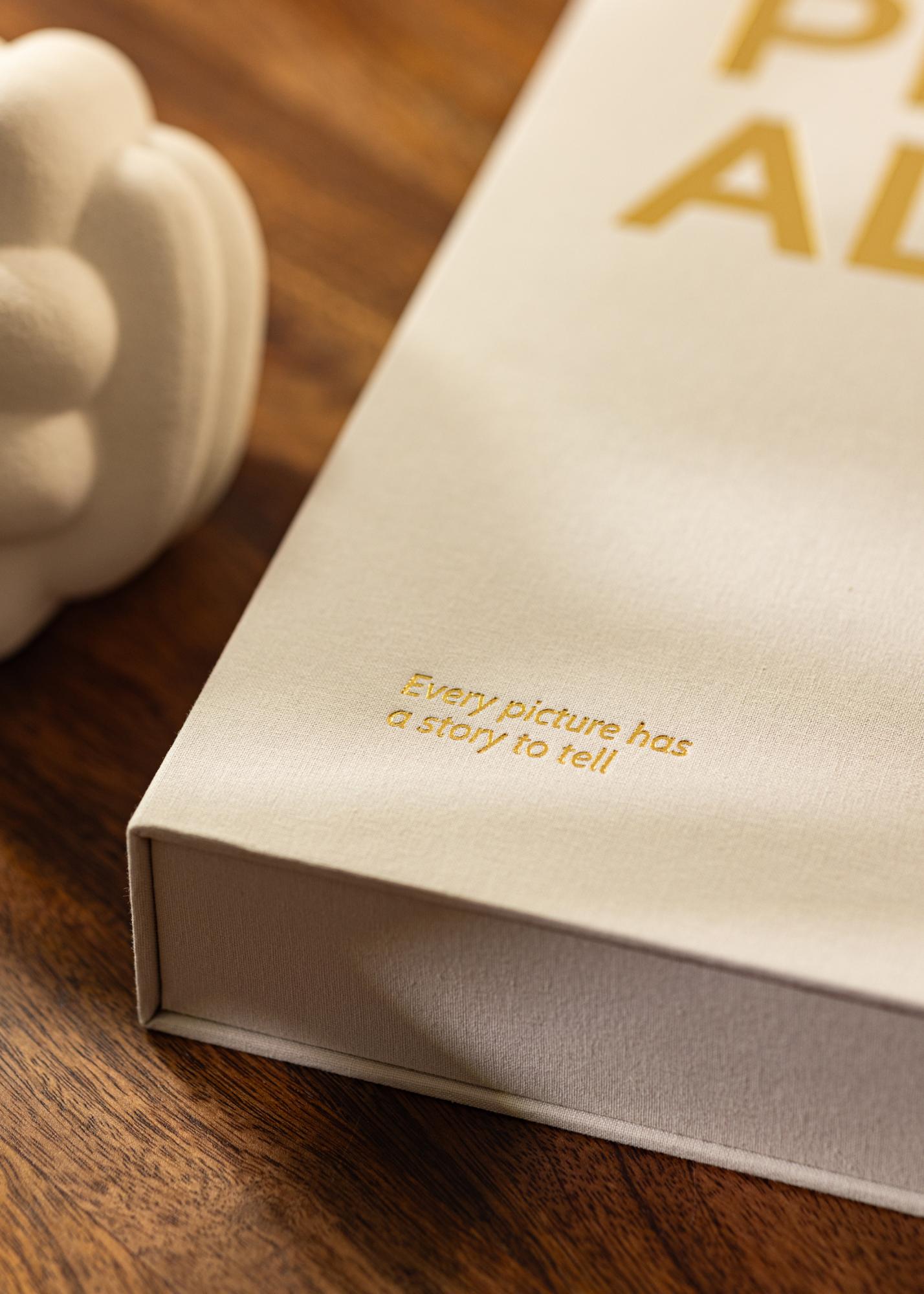 Dette er fotoalbumet for deg som leter etter et album som rommer dine fineste fotominner og som også er fint å ha liggende framme. Albumet er utformet som en Coffee Table Book, med moderne design som kan bli en dekorasjon på stuebordet eller i bokhyllen. Det er utformet som en eksklusiv eske, med omslag i stilig kremfarget stoff. Når du åpner albumet blir du møtt av en ringperm med 60 svarte albumsider (30 ark) som du kan fylle med fotografier fra fine øyeblikk. Du limer selv inn bildene akkurat der du vil ha dem.