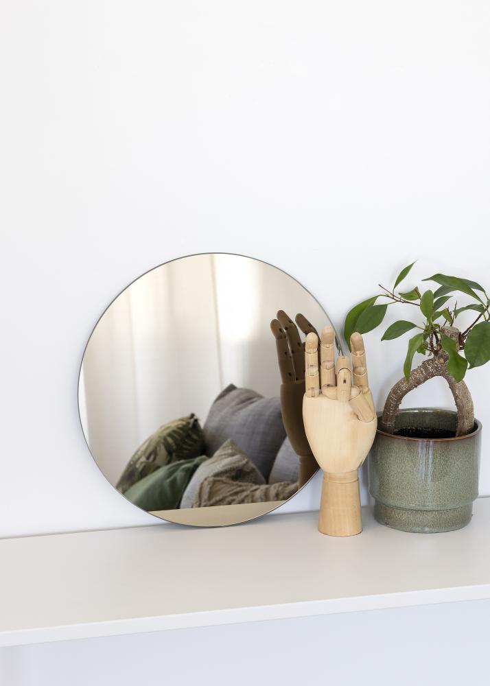 Dette runde speilet har tynt design uten ramme, noe som gir et elegant og eksklusivt utseende som løfter ethvert rom. Dette veggspeilet har speilglass i en bronsefarget nyanse som gir det en lun og hjemmekoselig fremtoning, og passer perfekt inn i moderne hjem. Speilet er en del av en serie runde, bronsefargede speil fra KAILA, og du kan velge mellom syv forskjellige størrelser for å finne det speilet som passer best til hjemmet ditt. Denne modellen har en diameter som måler 30 cm. Du kan enkelt henge opp speilet i gangen eller stuen ved hjelp av veggfestet.