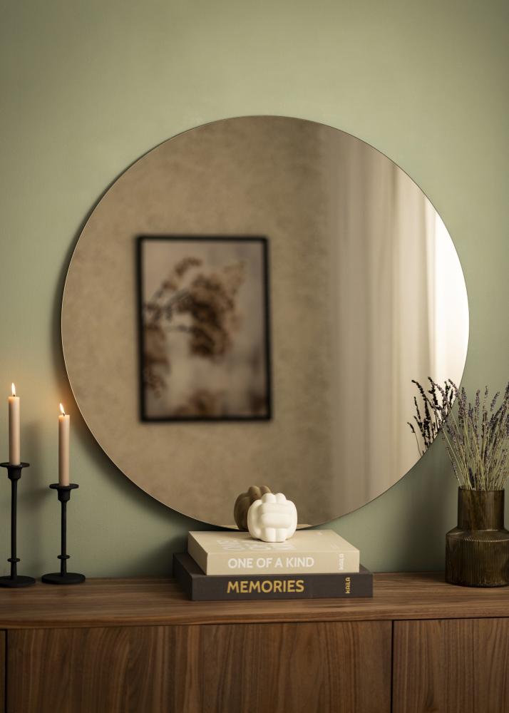 Dette runde speilet har tynt design uten ramme, noe som gir et elegant og eksklusivt utseende som løfter ethvert rom. Dette veggspeilet har speilglass i en bronsefarget nyanse som gir det en lun og hjemmekoselig fremtoning, og passer perfekt inn i moderne hjem. Speilet er en del av en serie runde, bronsefargede speil fra KAILA, og du kan velge mellom syv forskjellige størrelser for å finne det speilet som passer best til hjemmet ditt. Denne modellen har en diameter som måler 90 cm. Du kan enkelt henge opp speilet i gangen eller stuen ved hjelp av veggfestet.