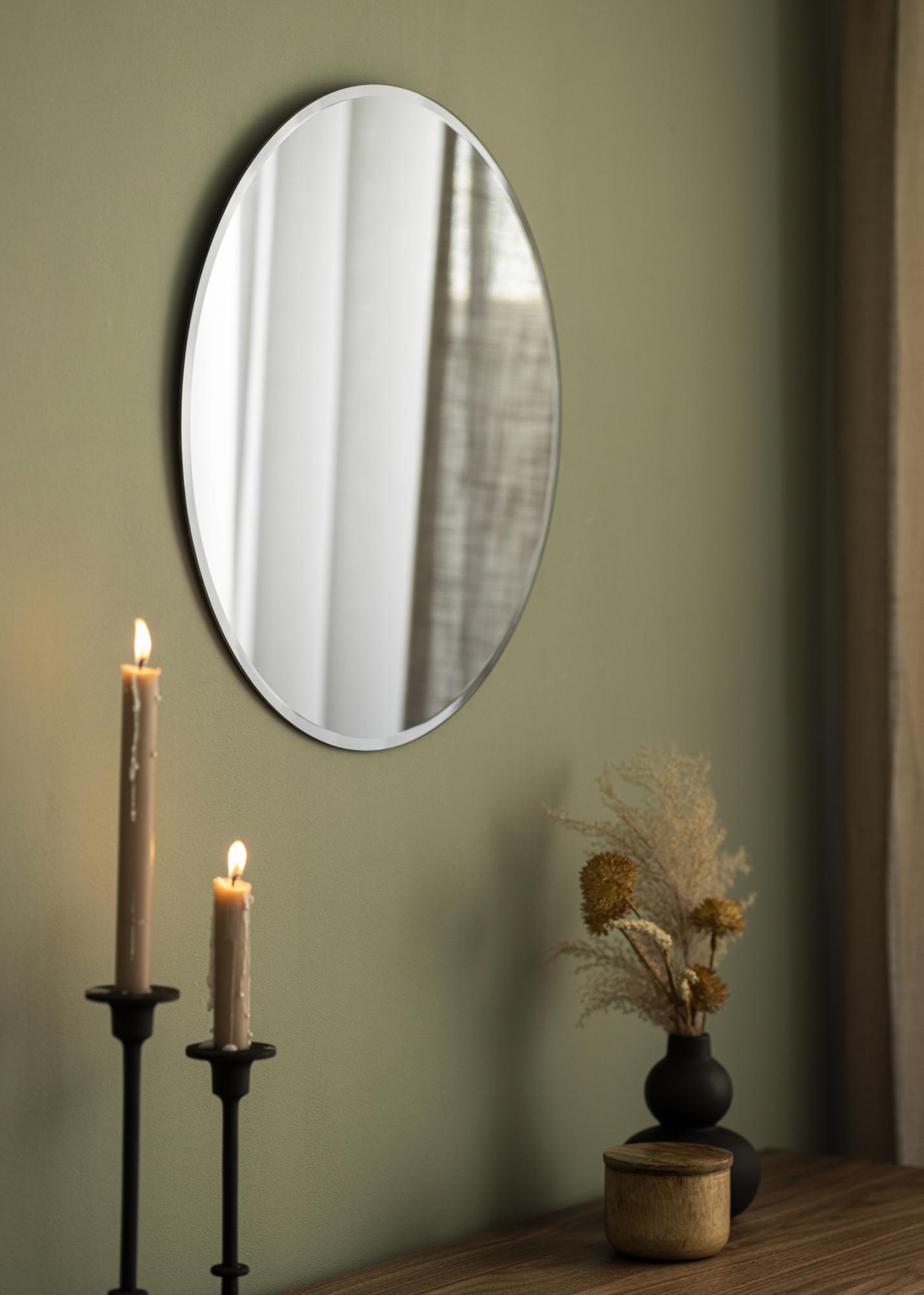 Den elegante følelsen som speilets form og farge formidler, forsterkes av at speilet ikke har noen ramme. I stedet er kantene dekorert med en pen fasettert kant, som gir speilet det lille ekstra.