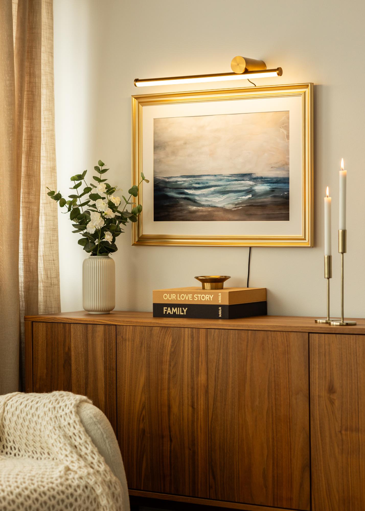 Lyskilden består av en LED-belysning som gir et varmhvitt lys med en fargetemperatur på 3000K. Dette innebærer at lyset er behagelig og skaper en innbydende atmosfære uten å være for sterkt. Lysstyrken er på 780 lumen, som gir et passe sterkt lys for å fremheve dine bilder uten å overvelde rommet. Lyset sprer seg jevnt over overflaten, noe som gjør at alle detaljene i kunstverket trer frem på en naturlig måte.