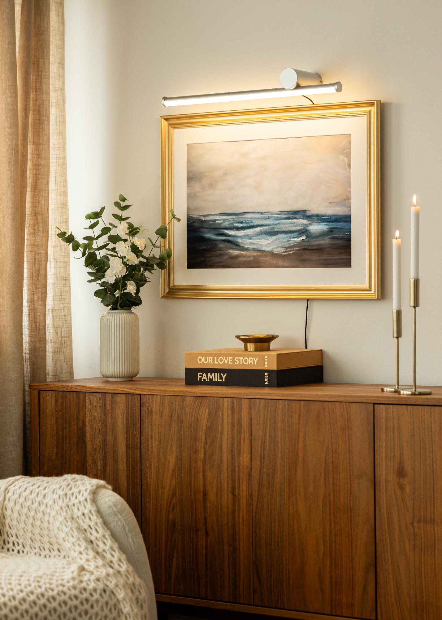Belysningen er utstyrt med en LED-lyskilde som gir et varmhvitt lys på 3000K. Dette lyset er behagelig og skaper en myk og innbydende atmosfære i rommet uten å være for sterkt. Lysstyrken er 780 lumen, noe som gir nok lys til å fremheve detaljene i kunsten din uten å bli overveldende. Lyset spres jevnt og gjør at hver del av bildet vises tydelig.