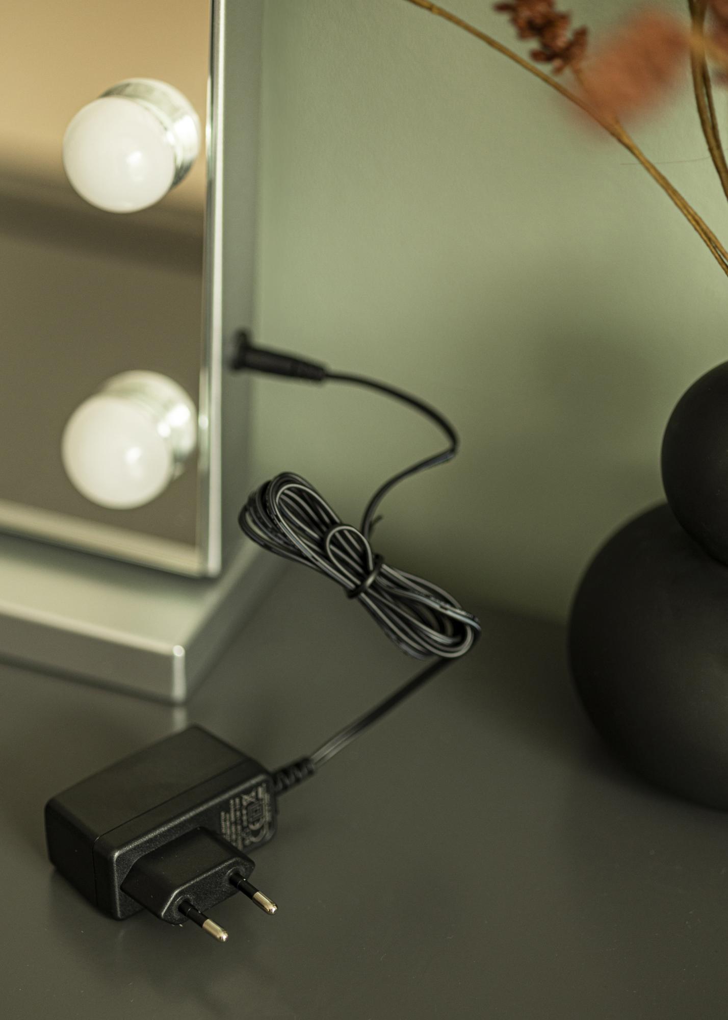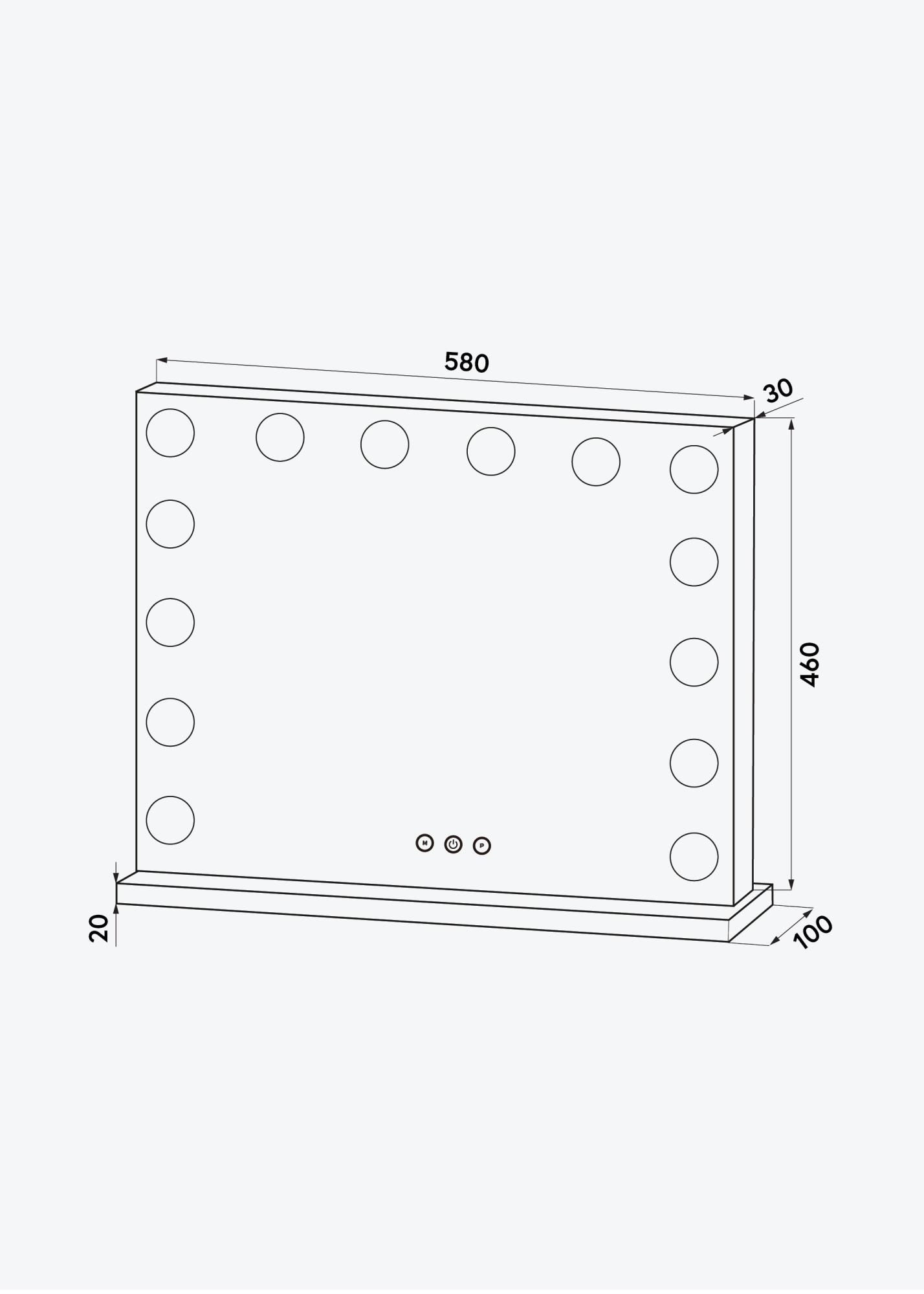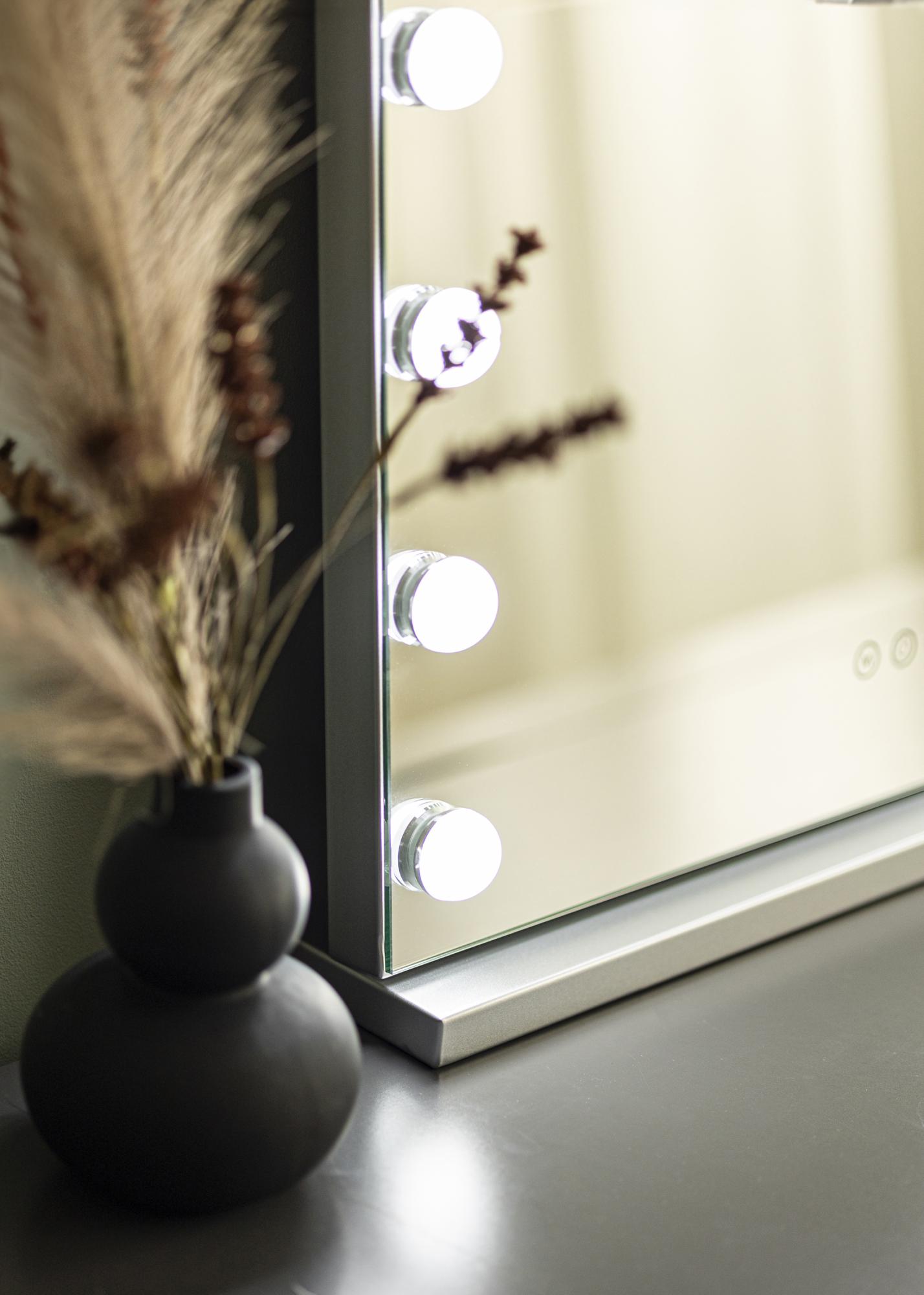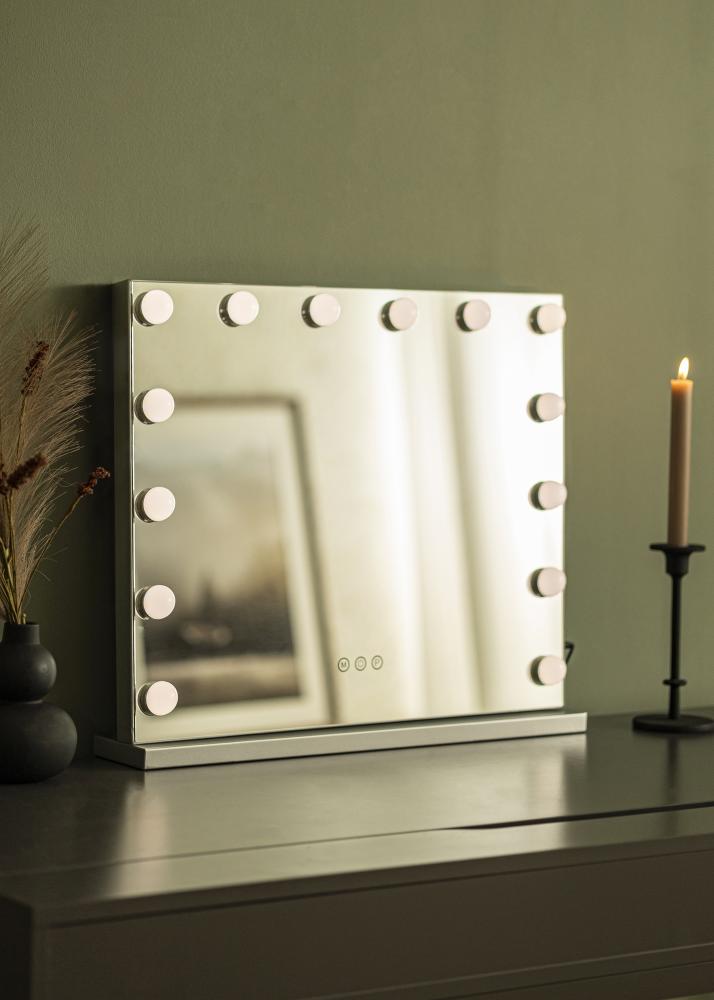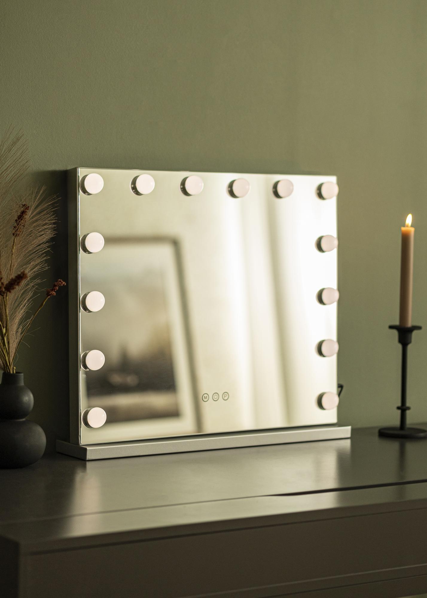 Dette sminkespeilet har elegant design, med en tidløs rektangulær form og 14 LED-lyspærer som gir godt lys når du sminker deg. Lyspærene sitter som en ramme rundt den 56x46 cm store speilflaten. Lyset kan dimmes, og du kan også stille inn den fargetemperaturen du vil ha. For å dimme lyset holder du på touch-knappen merket med ""P"", og for å justere fargetemperaturen fra 3000K-6000K holder du på knappen merket med ""M"". Speilet har også en touch-knapp til å slå av og på belysningen med. Speilet kobles til strøm via stikkontakt.