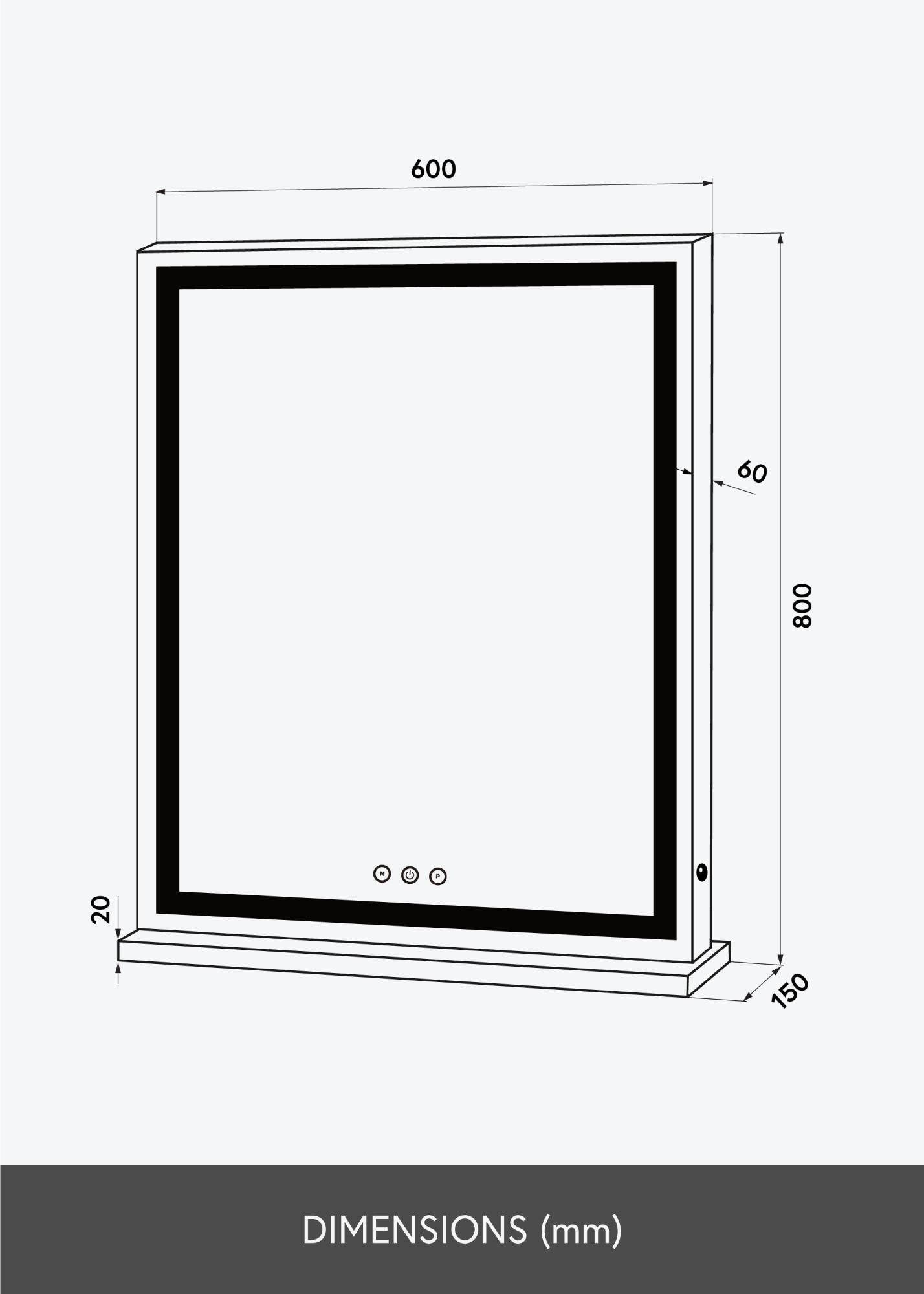 På den nedre kanten av speilet er det tre touch-knapper – en som slår av og på belysningen, og to som endrer lysinstillingene. ”M”-knappen justerer lysets fargetemperatur fra 3000K-6000K, og med ”P”-knappen kan du dimme belysningen. Med andre ord kan du altså stille inn det perfekte lyset for enhver situasjon.