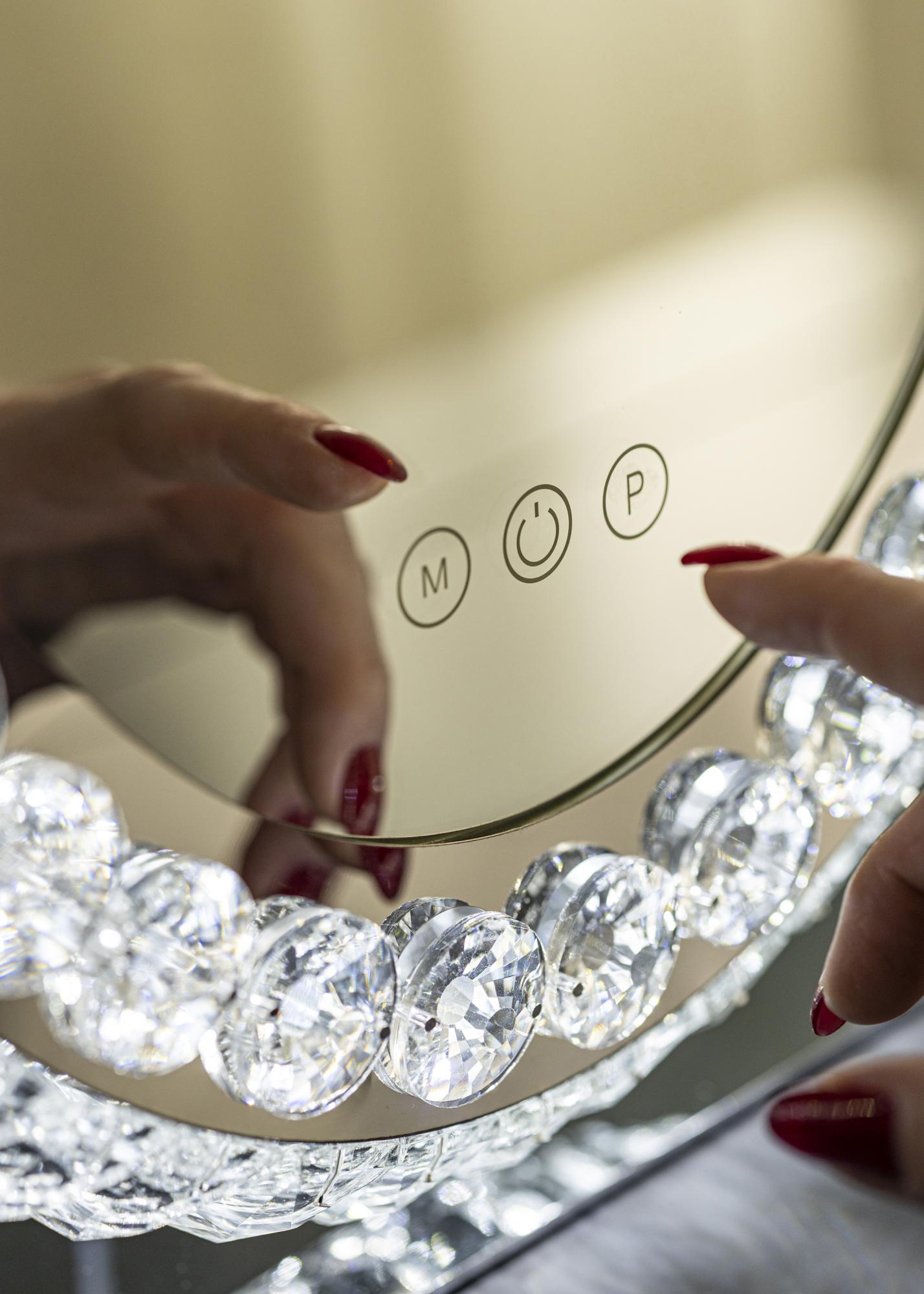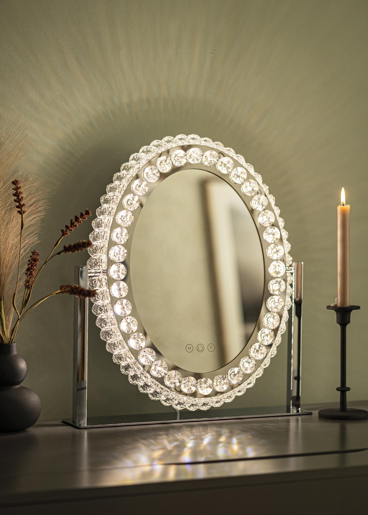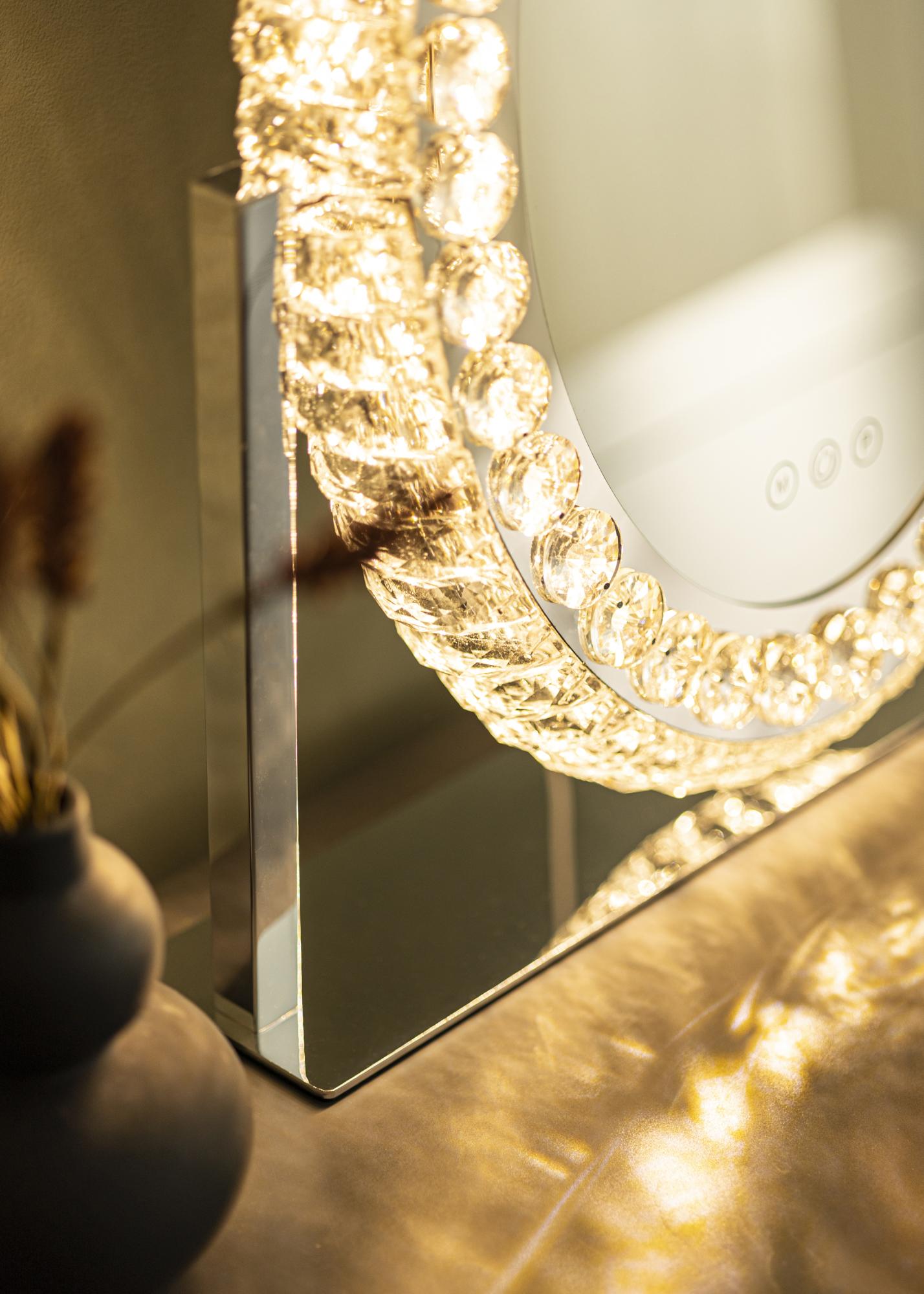 Dette er et sminkespeil i klassisk stil, med dekorativ ramme og LED-belysning. Speilets ovale form og ramme med krystall-liknende utsmykninger, gir det et luksuriøst utseende som passer fint både på soverommet og i stua. Det er laget av rustfritt stål og har stående design.