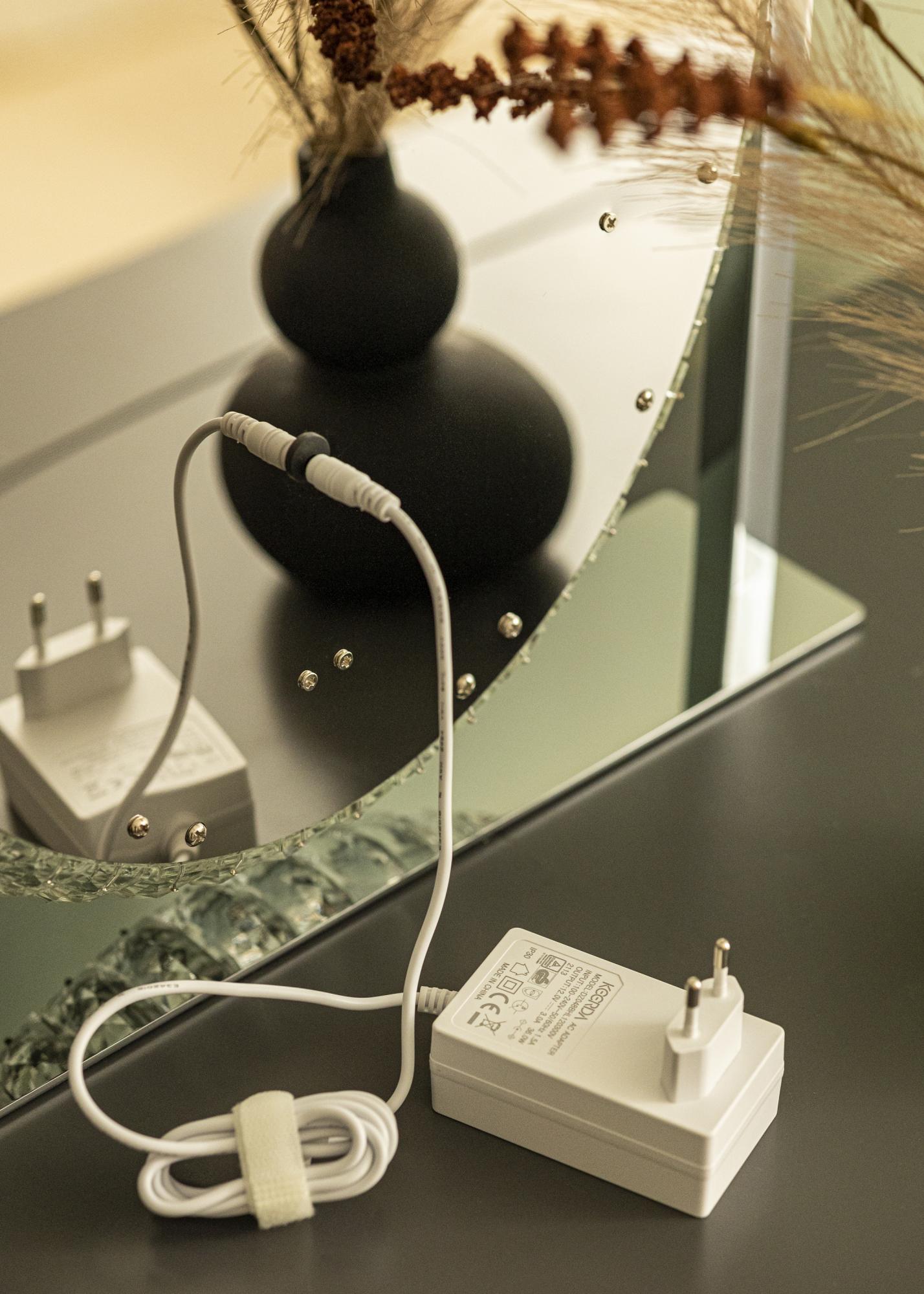 Den innebygde LED-belysningen gir et behagelig lys - perfekt når du sminker deg og gjør deg klar for dagen. Du kan dessuten justere lyset ved hjelp av touch-knappene på den nedre kanten av speilet. Med "M"-knappen kan du endre belysningens fargetemperatur, og med "P"-knappen kan du dimme lyset til ønsket styrke. Det er også en av-/på-knapp til å slå av og på speilbelysningen med. Speilet kobles til strøm via stikkontakt.