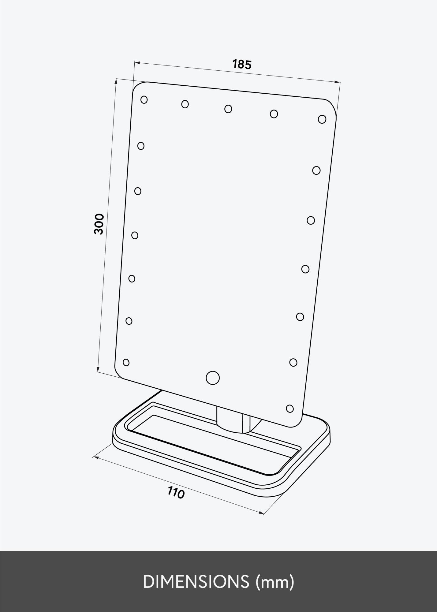 Speilet har integrert LED-belysning som slås av og på med en på-/av-knapp på baksiden. Belysningen gir et kaldt hvitt lys som kan dimmes. For å stille inn lysstyrken holder du inne touch-knappen på forsiden av speilet i noen sekunder. Det batteridrevne speilet drives av 4x AA-batterier, som kjøpes separat.