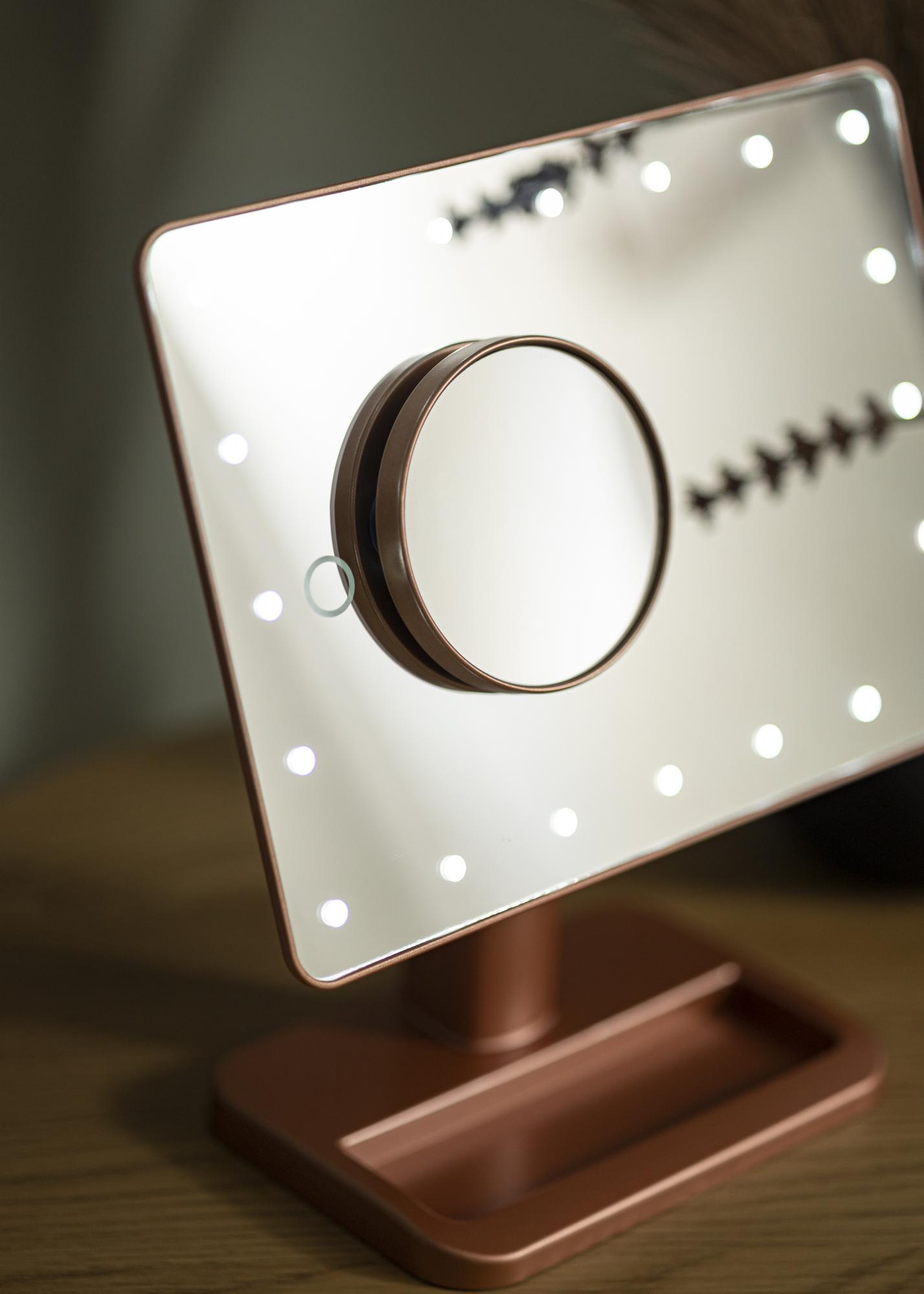 Dette er sminkespeilet for deg som vil ha et elegant og fleksibelt speil. Det plasseres stående, noe som gjør at du enkelt kan flytte speilet rundt i hjemmet eller ta det med deg når du er ute og reser. Den 16,5x25 cm store speilflaten kan vinkles for at du lettere skal kunne sminke deg akkurat som du vil. Et mindre speil med 10x zoom følger med, og det kan festes på speilflaten til hovedspeilet.