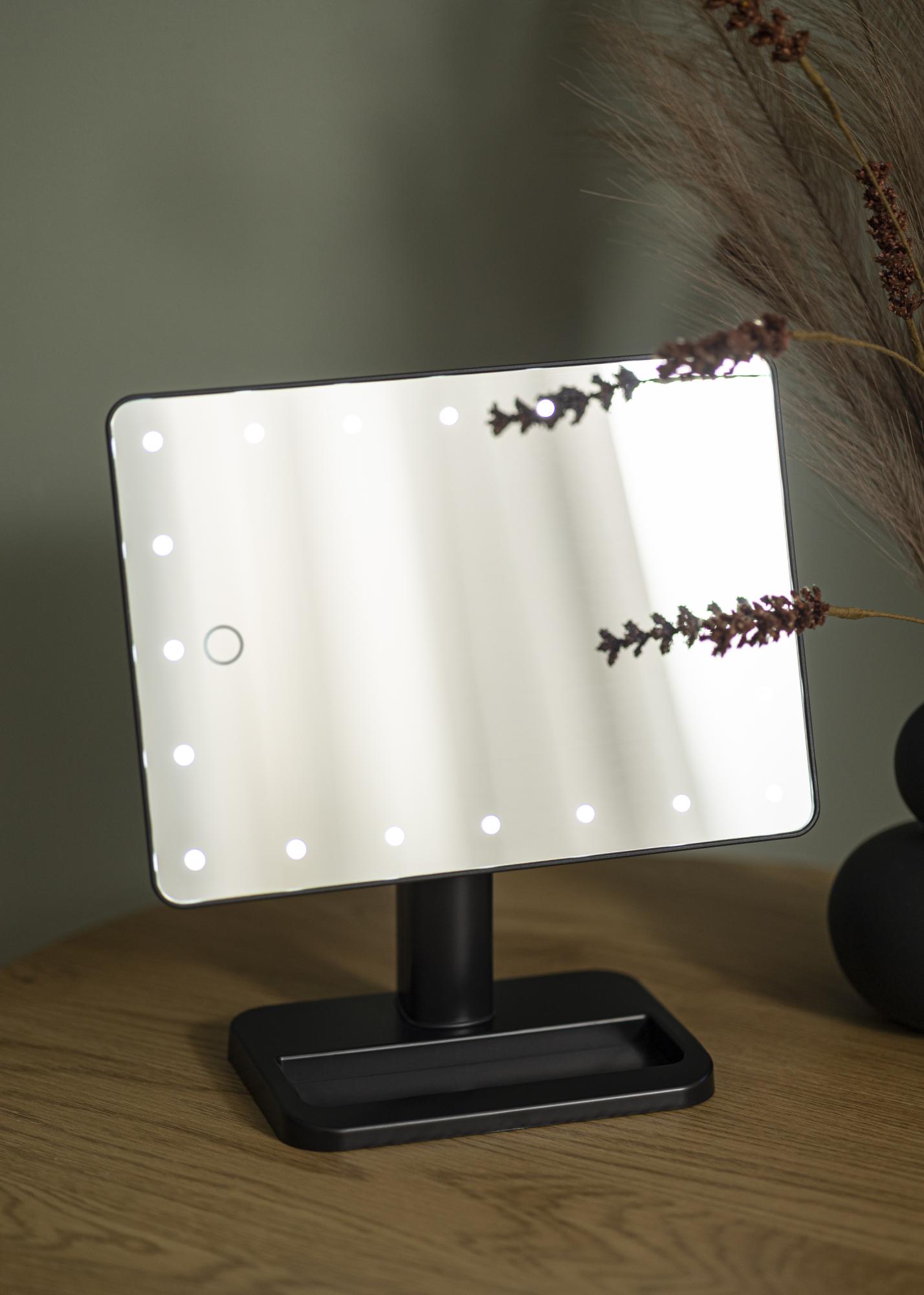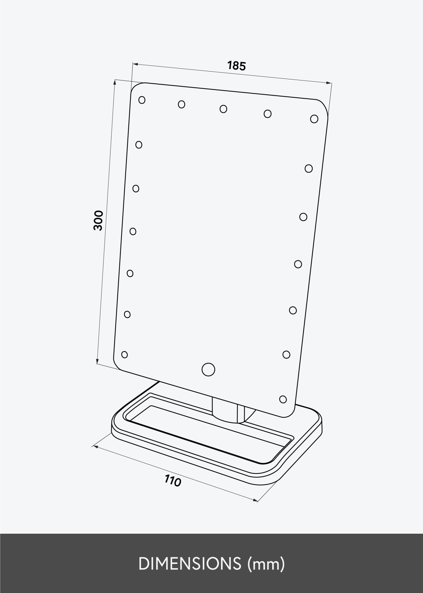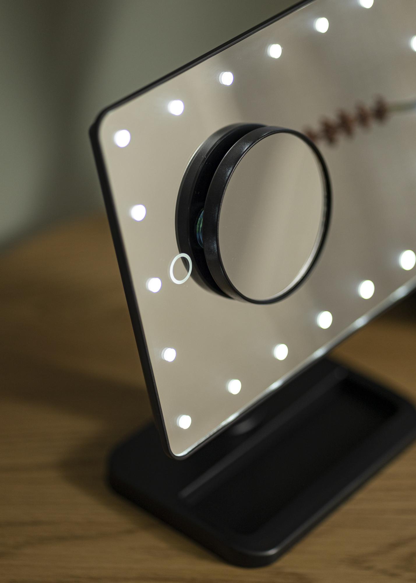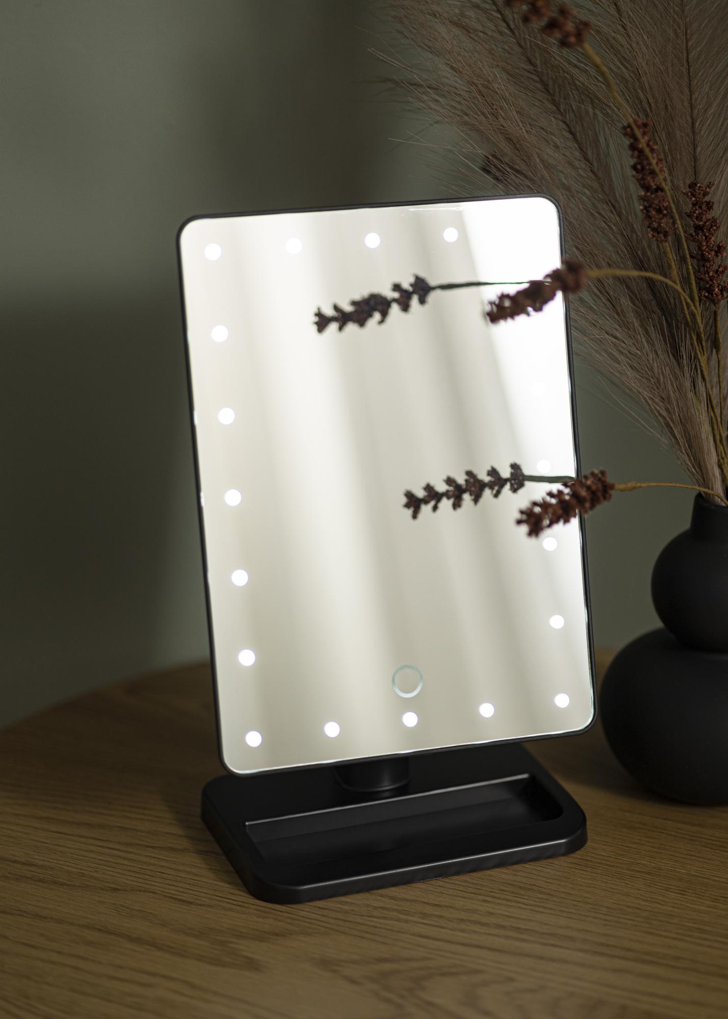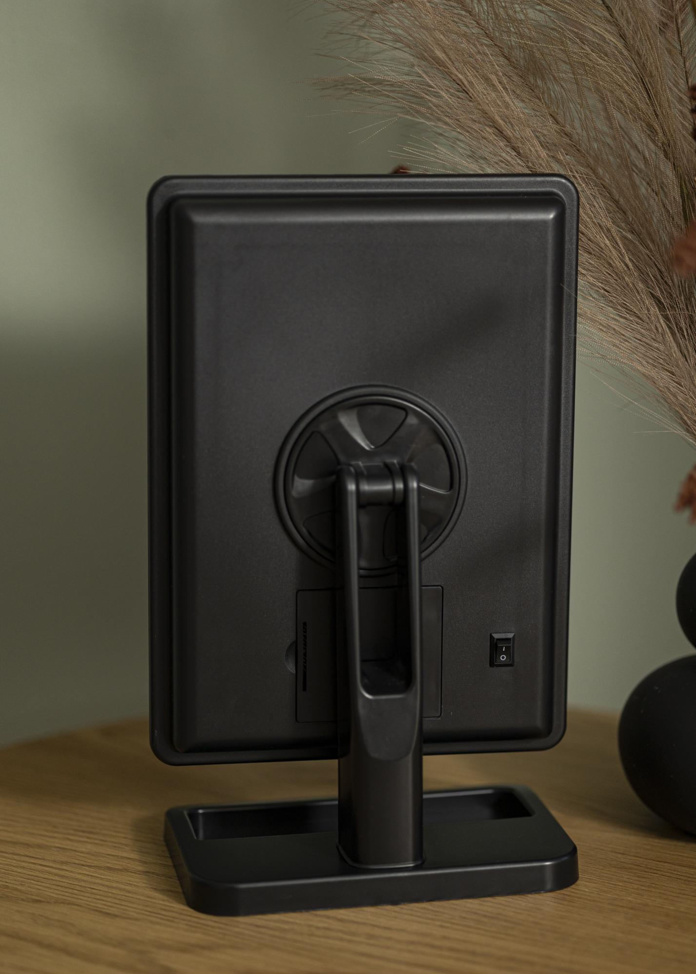 Kompakt design, stilig utseende og jevn belysning – Foot Svart gir deg alt du ønsker deg av et sminkespeil! Den 16,5x25 cm store speilflaten er omgitt av LED-belysning, en lyskilde som er både energibesparende og har lang holdbarhet. Speilet slås på via en knapp på baksiden. Du kan stille inn lysstyrken på kaldt hvitt lys ved å holde inne touch-knappen på forsiden av speilet i noen sekunder.