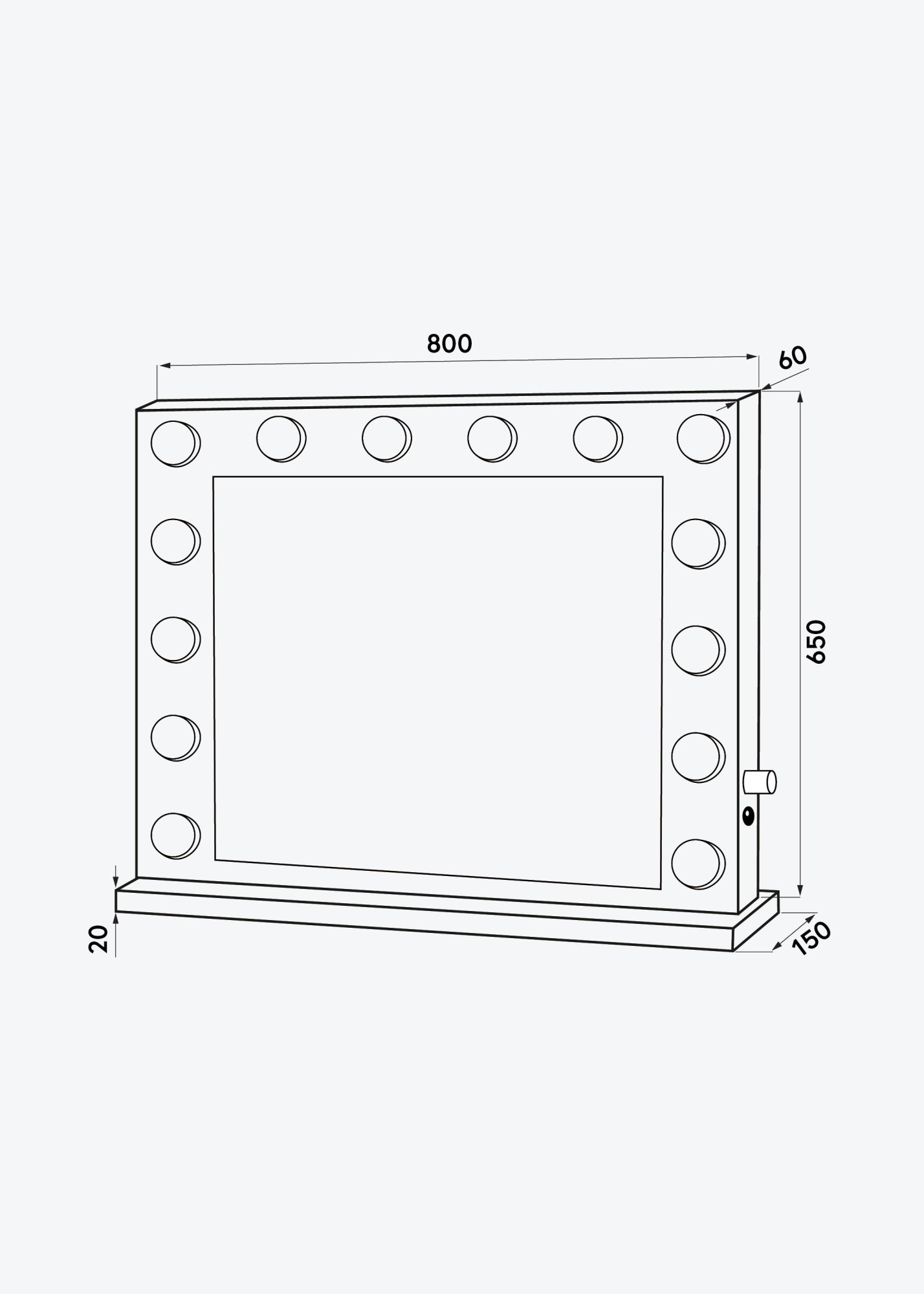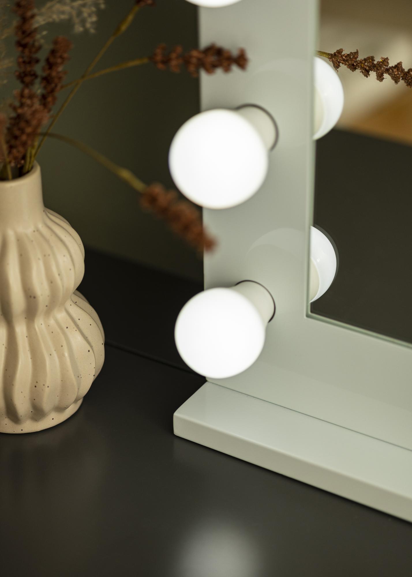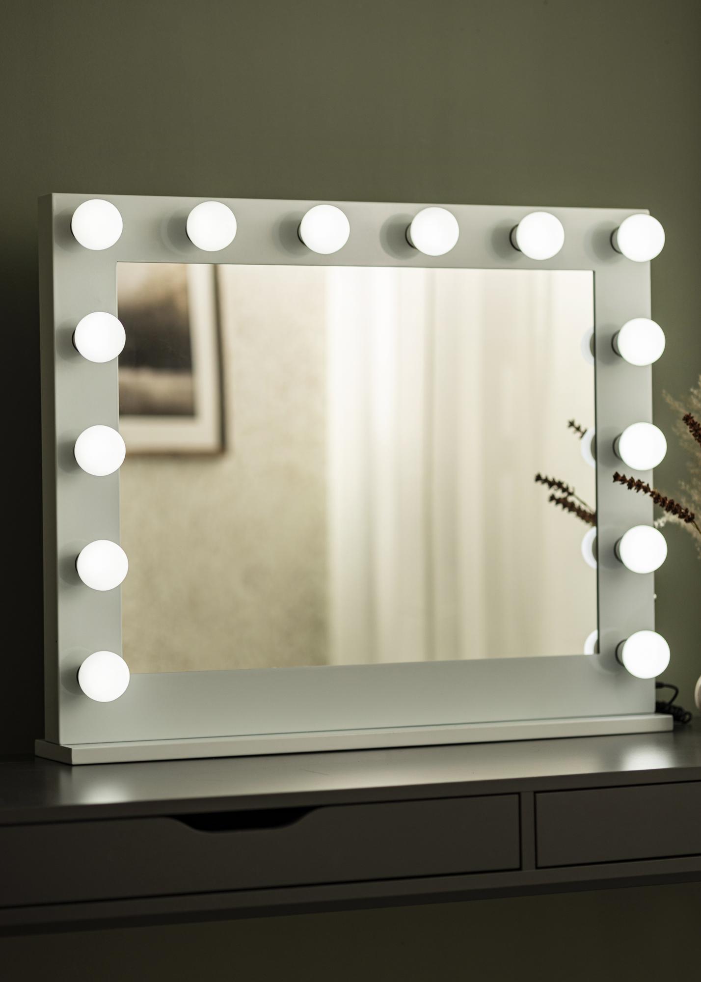 Dette er et stort sminkespeil med innebygd belysning – perfekt når du skal sminke deg eller speile deg før du går ut. Det store formatet med en 80x65 cm stor speilflate, kombinert med en stilig hvit ramme med 14 utskiftbare lyspærer, gir speilet en følelse av Hollywood-glamour. Lyspærene er av typen E27. Speilet plasseres stående på en skjenk, kommode eller en annen flat overflate du vil pynte med et vakkert sminkespeil. Hvis du vil henge opp speilet på veggen, kan foten tas av.